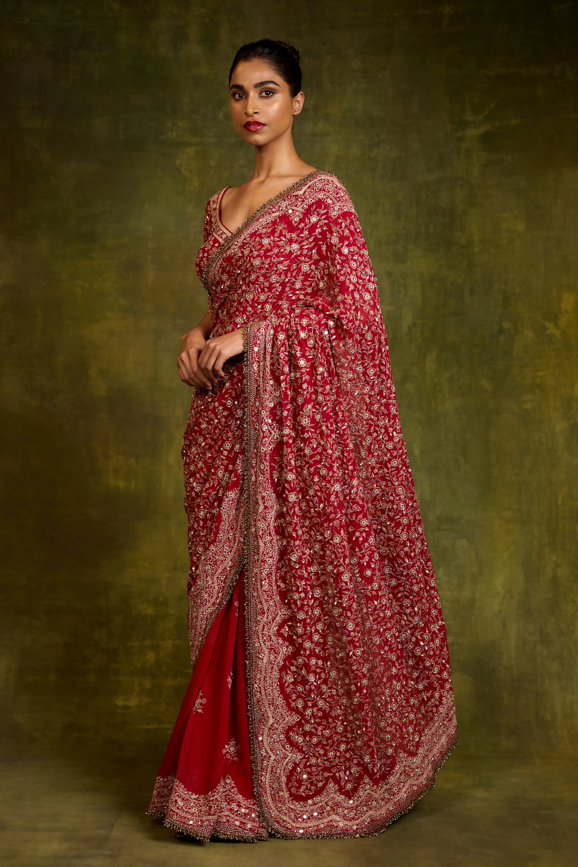 A striking red sari adorned with intricate thread and mirror work, reflecting artisanal craftsmanship and festive allure. Paired with a coordinating blouse from our signature Sheesha collection, this ensemble glows with reflective detailing and refined elegance. Rich in texture and tradition, yet effortlessly statement-making, it is a perfect choice for weddings and celebratory occasions.