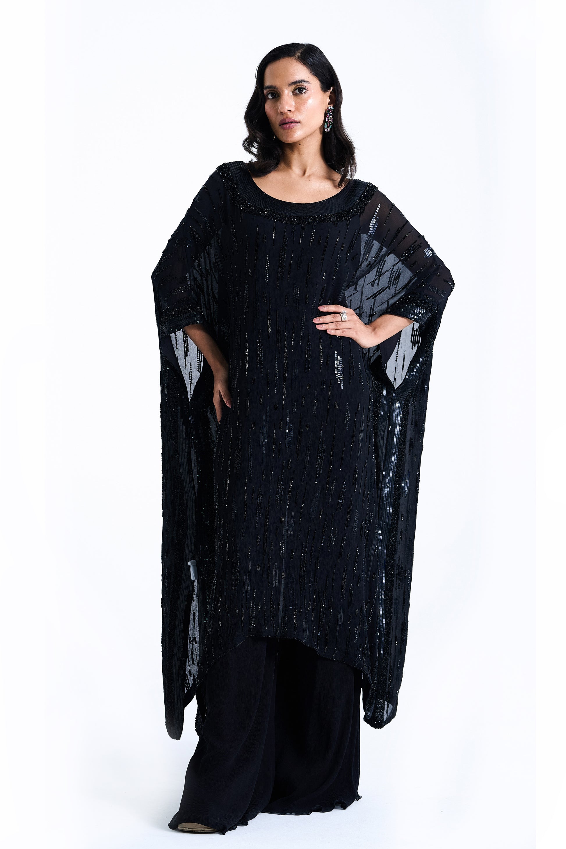 Kaftan in abstract sequin embroidery with inner and with straight chiffon palazzos