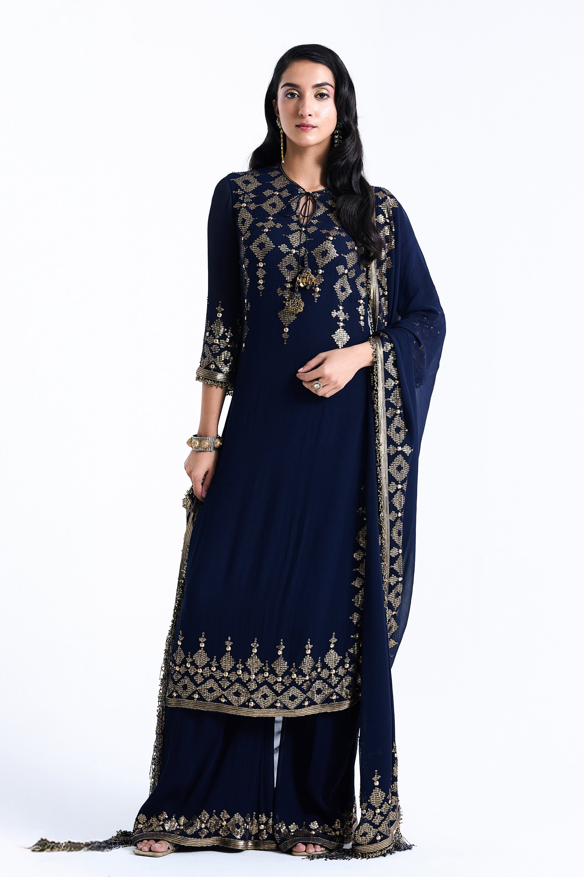 Kurta, Palazzo and Dupatta in Sequin Diya Border Design
