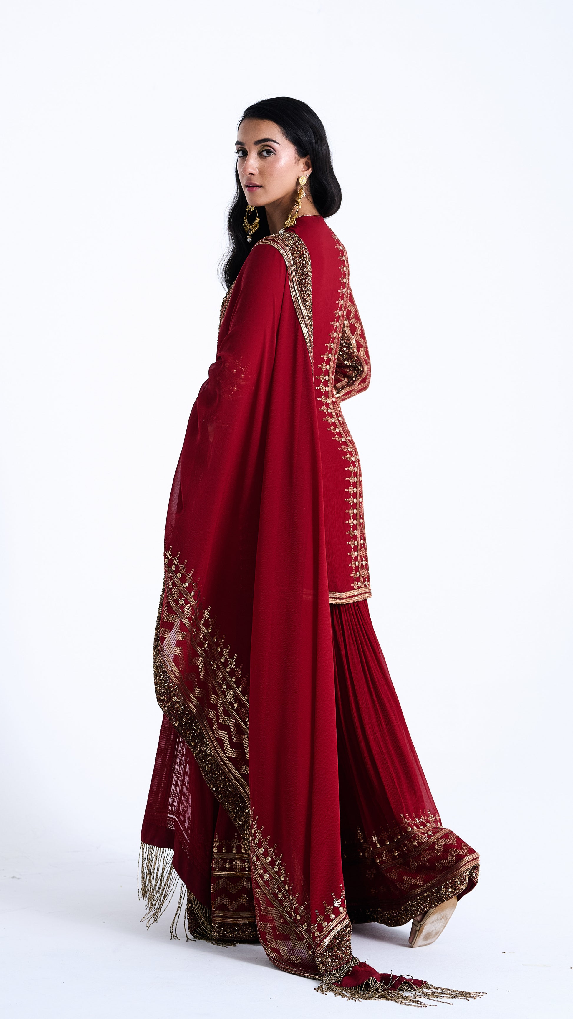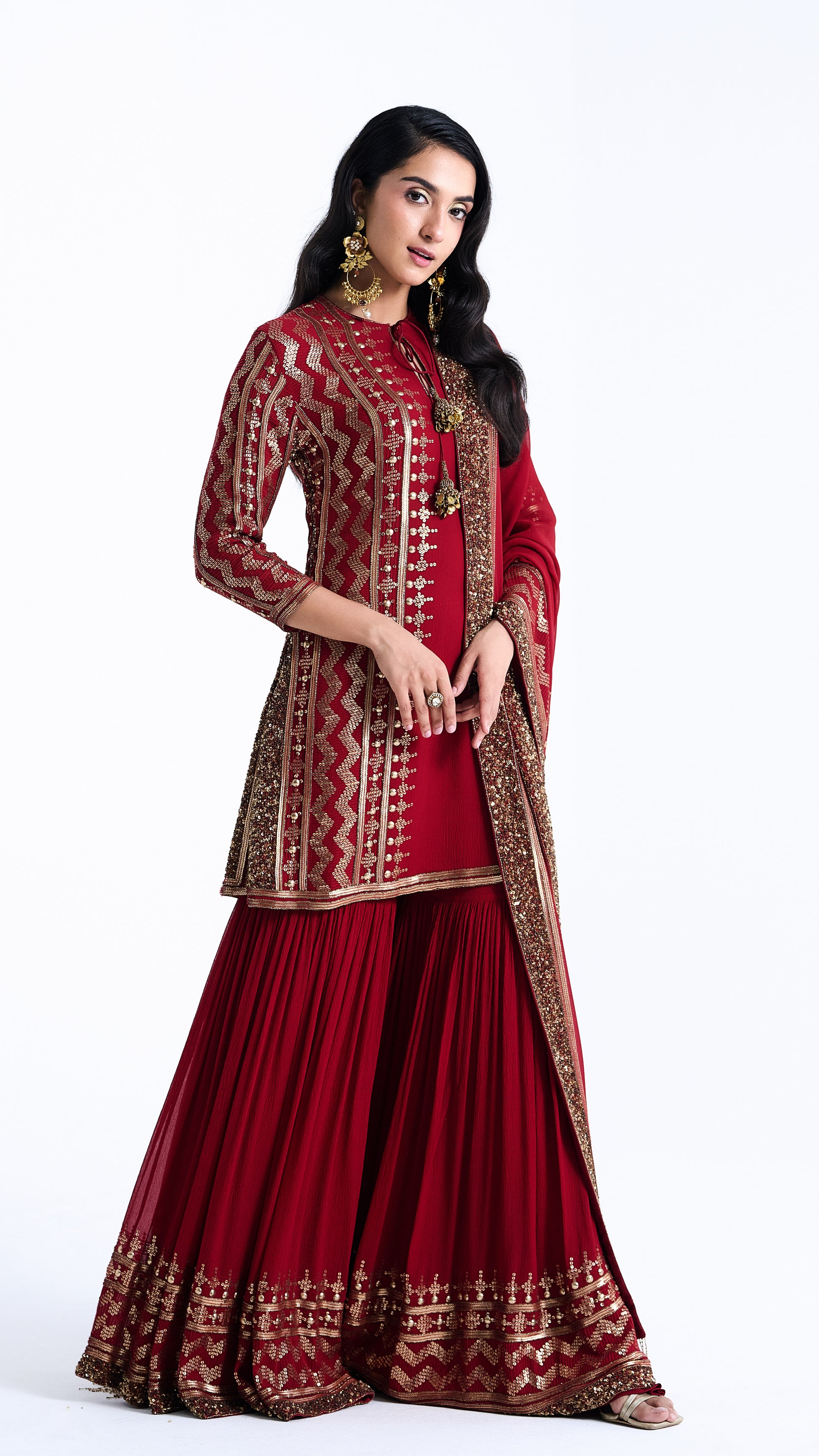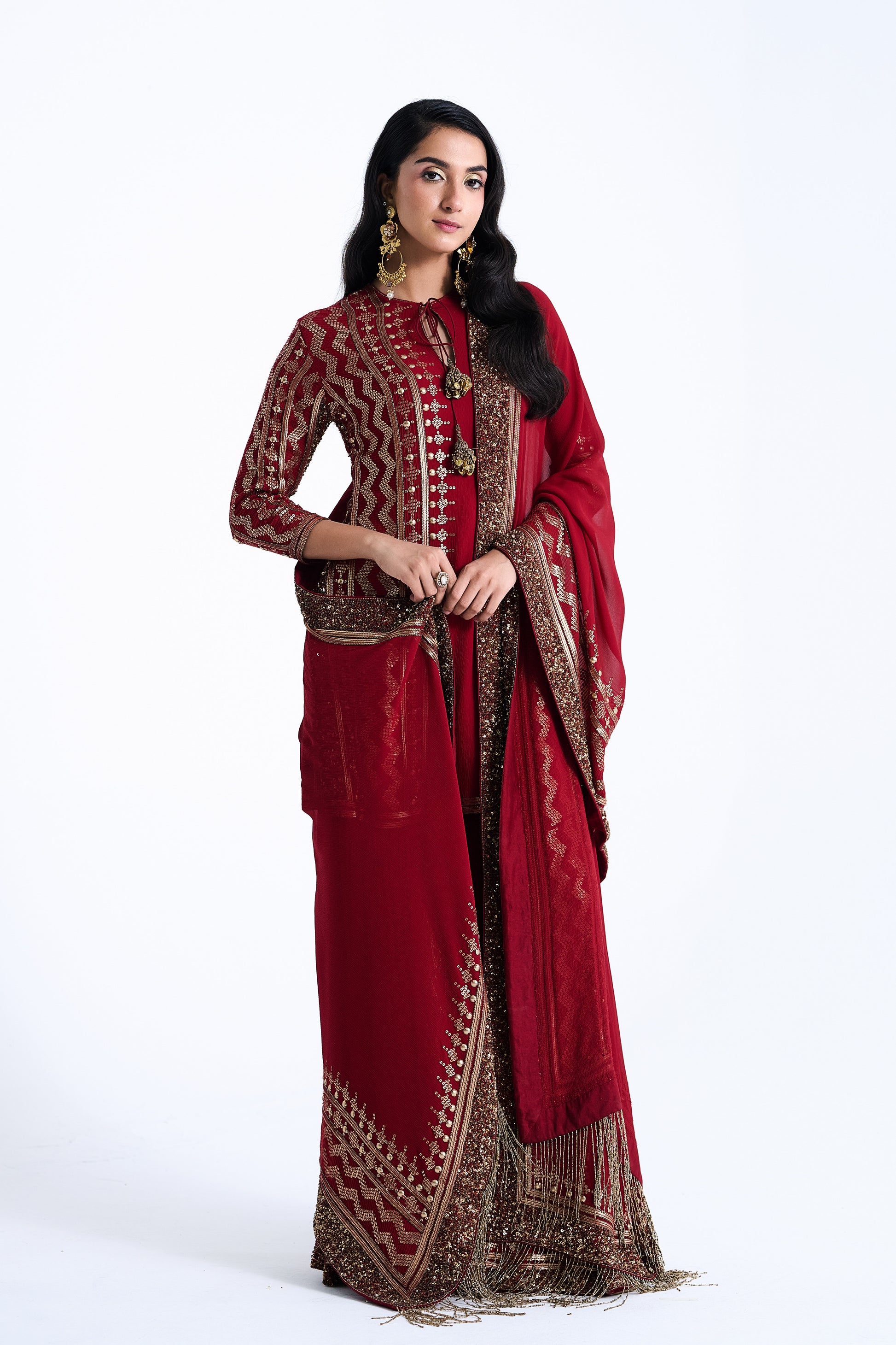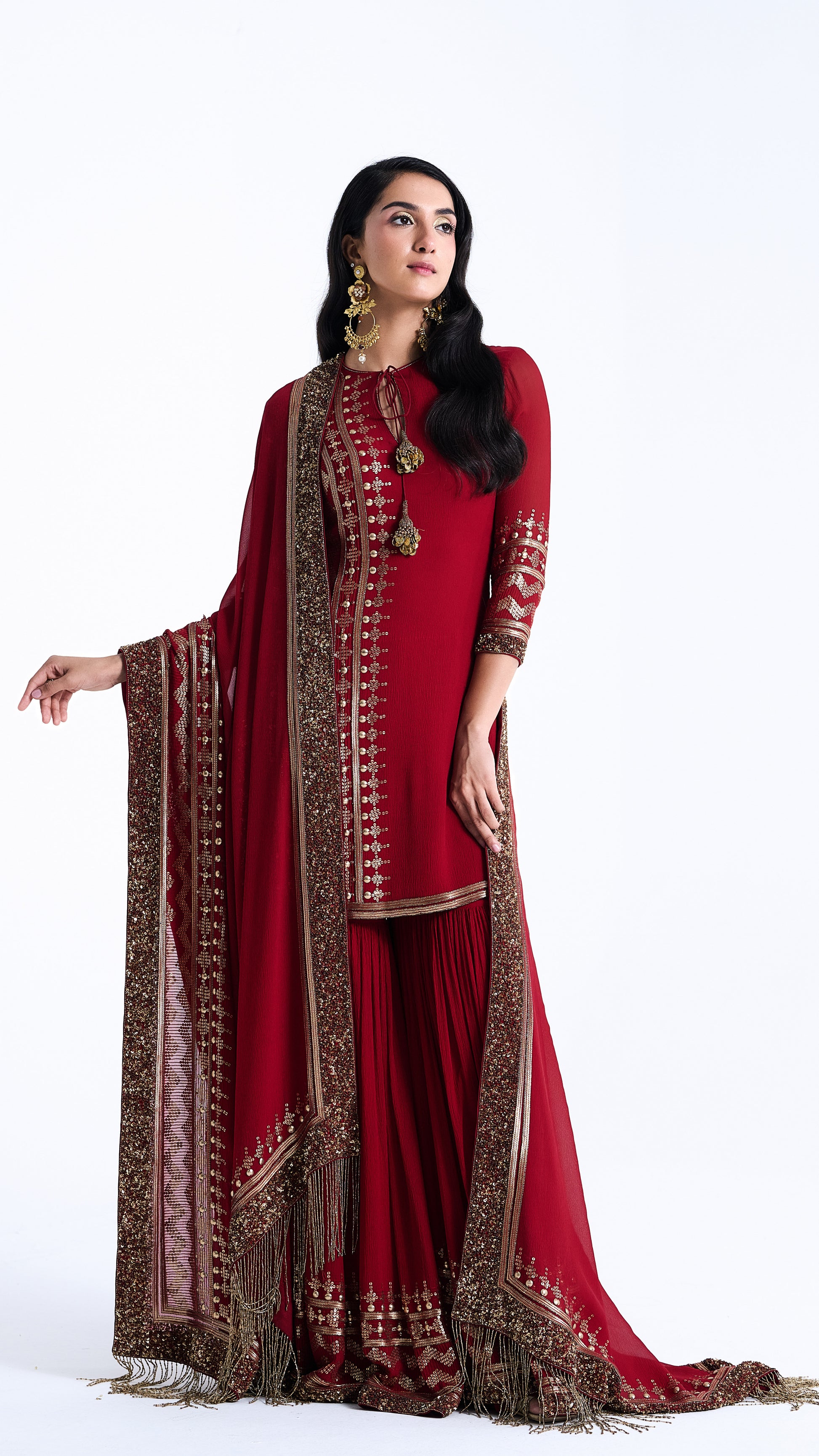 Command attention in this red gharara set, where sequined diya borders create a mesmerizing border effect. This regal three-piece ensemble combines traditional silhouettes with contemporary embellishments for a show-stopping look.