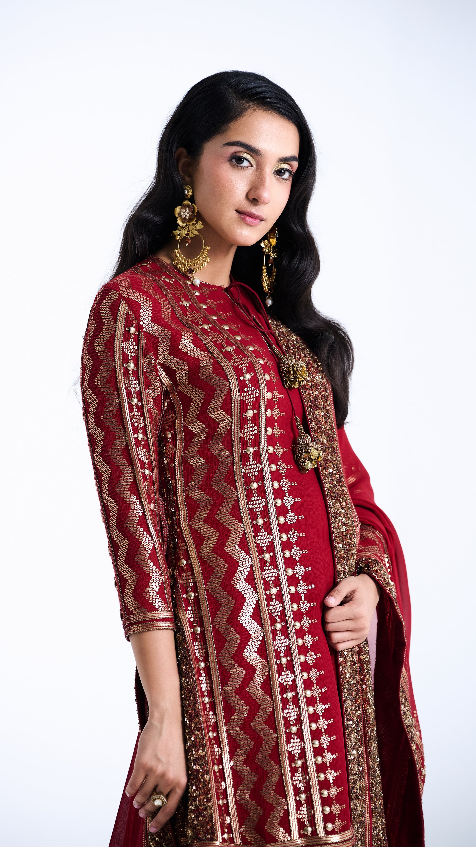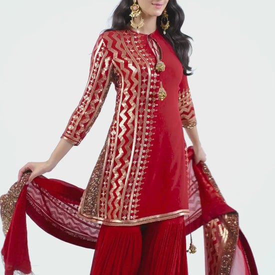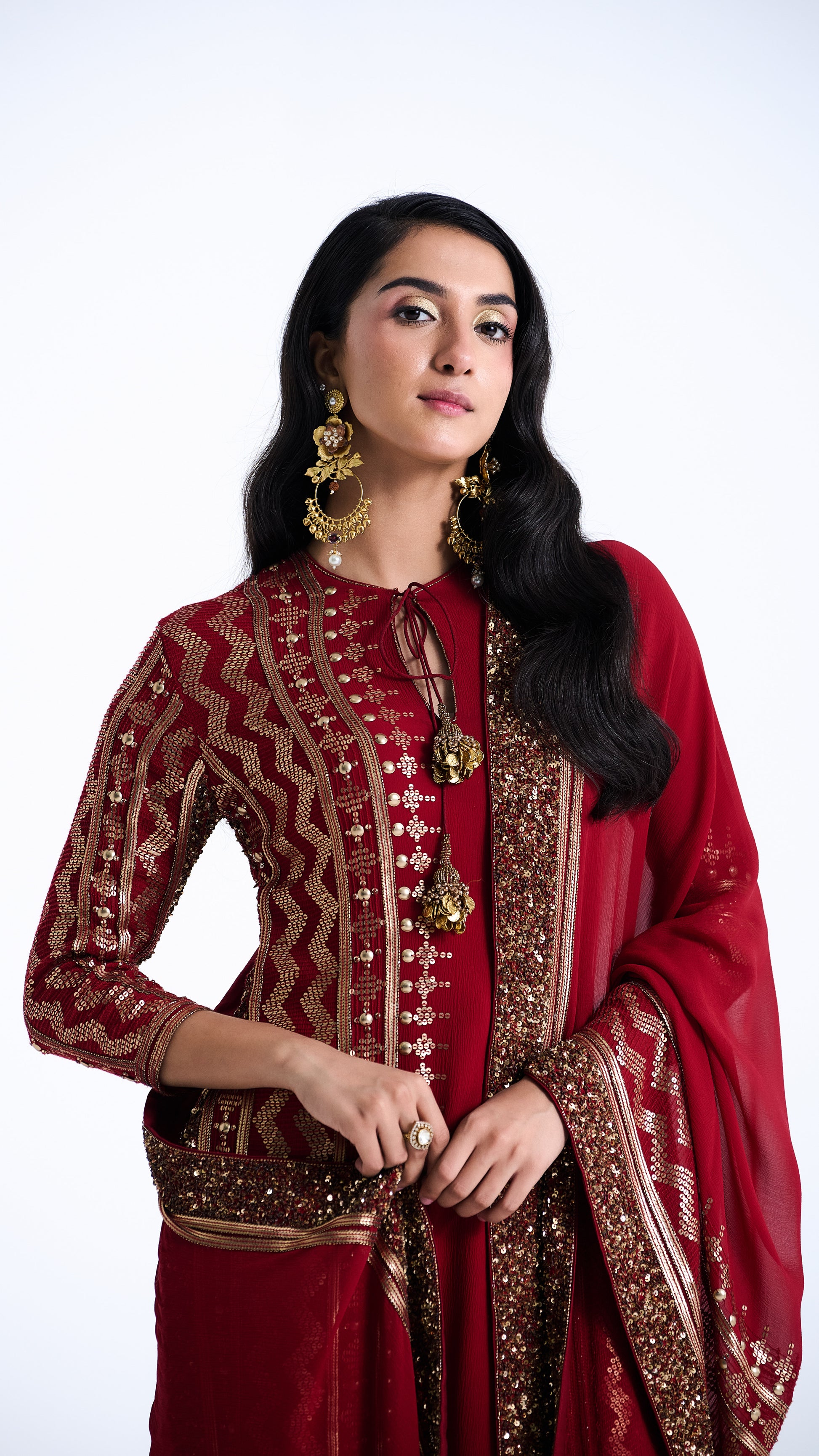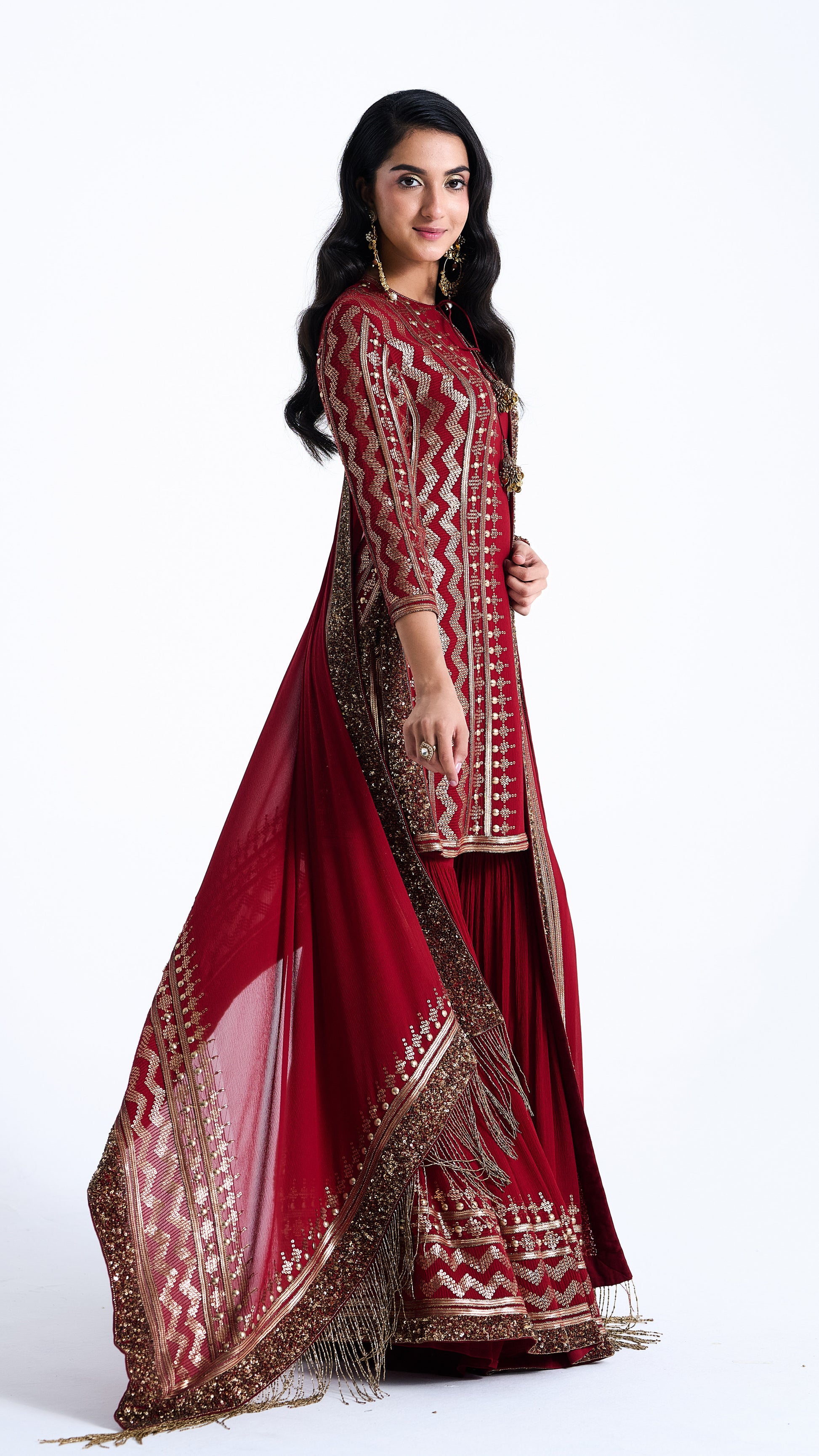 Command attention in this red gharara set, where sequined diya borders create a mesmerizing border effect. This regal three-piece ensemble combines traditional silhouettes with contemporary embellishments for a show-stopping look.