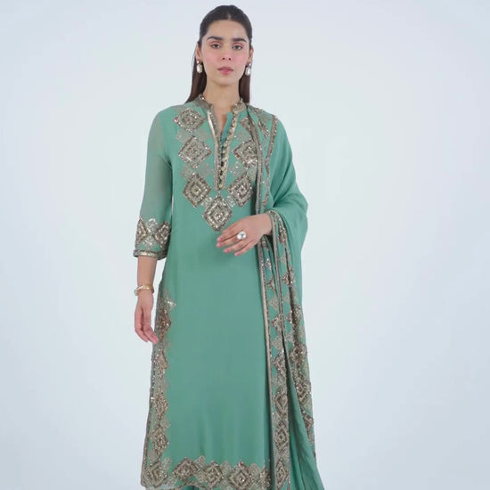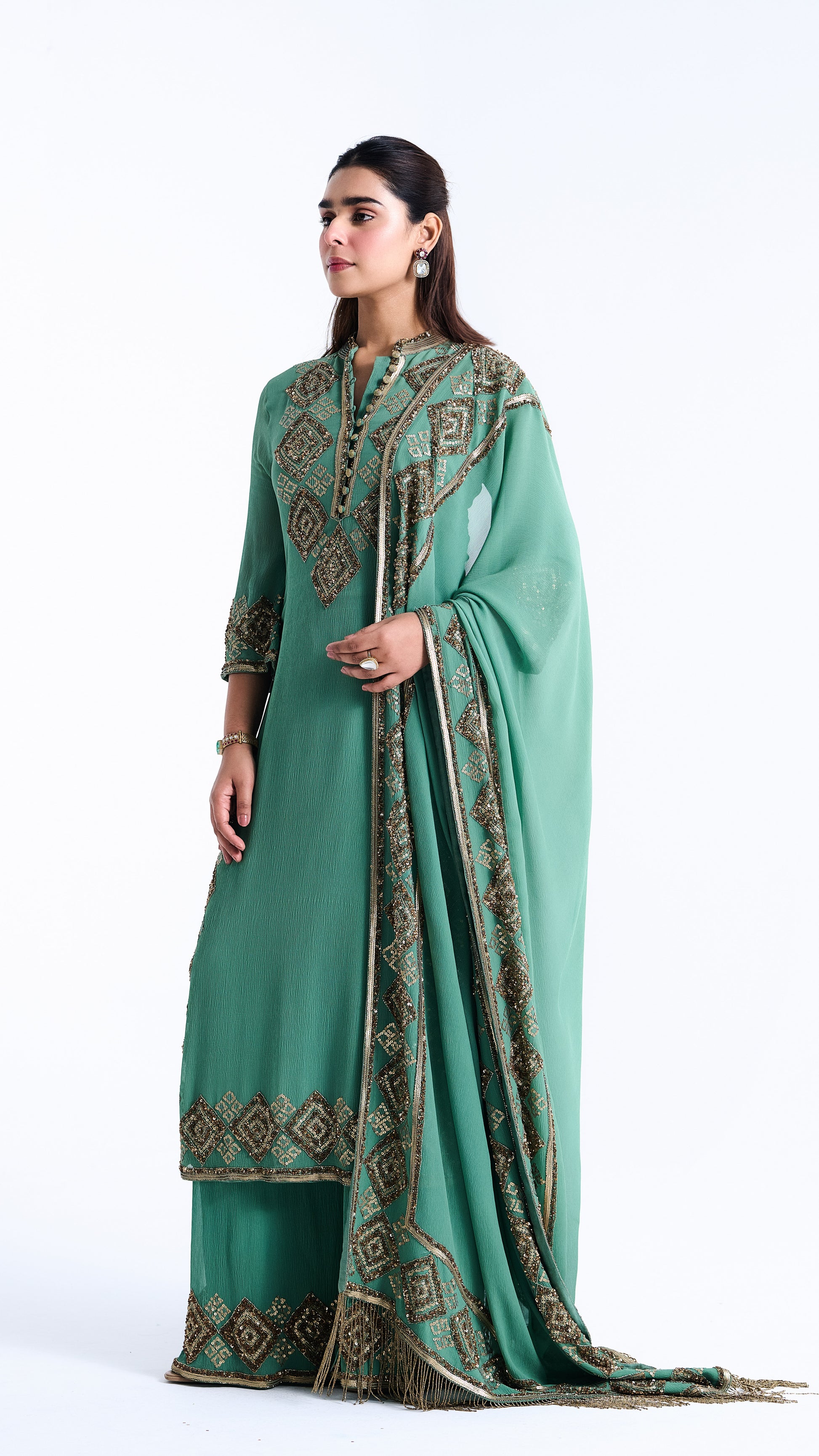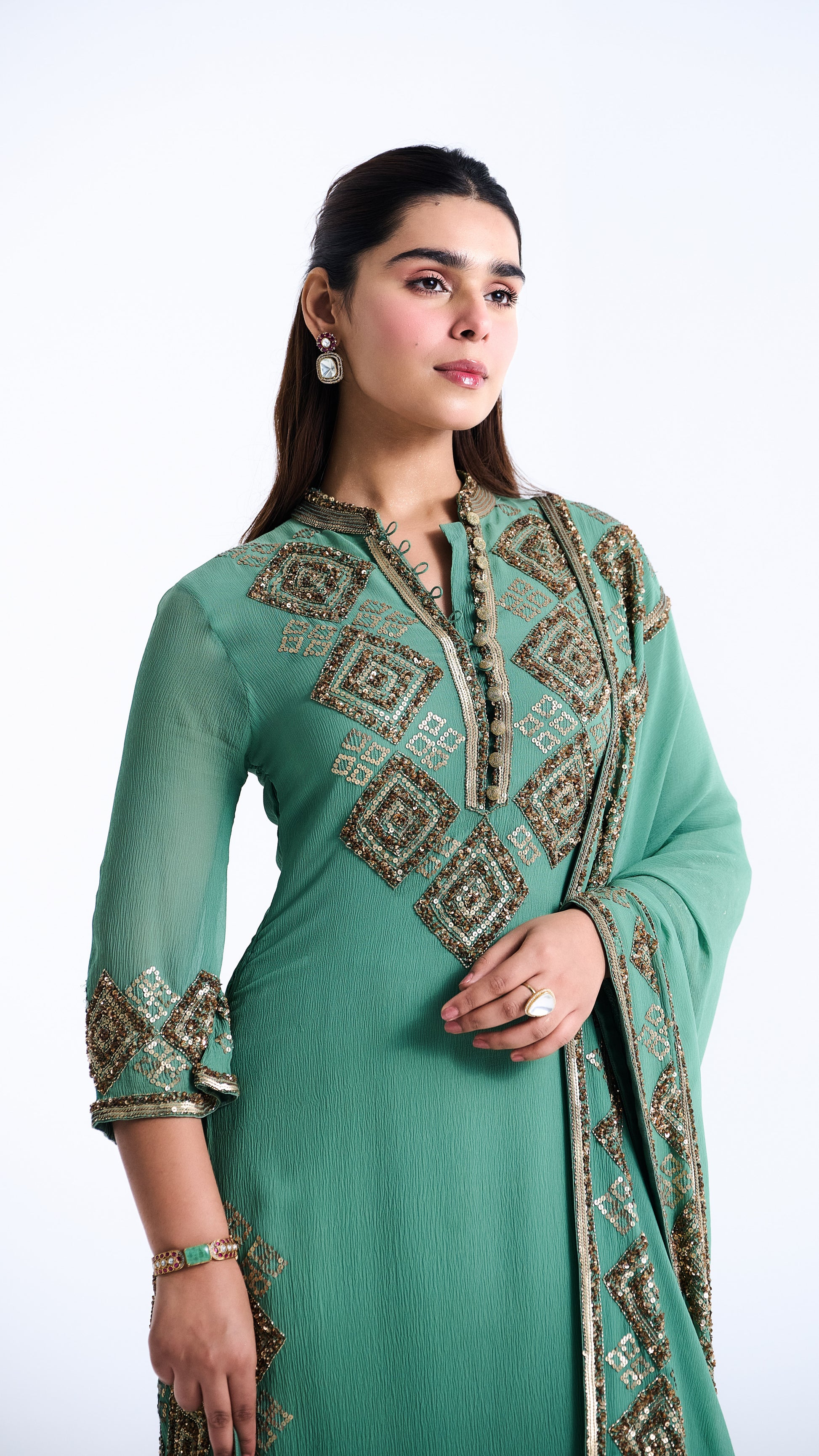 Kurta in rich jade tone complements the geometric sequin work, while the comfortable regular palazzo and coordinating dupatta complete this sophisticated ensemble.