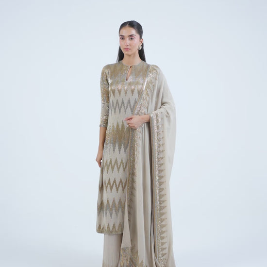 Featuring an intricate zig-zag cutdana pattern in the kurta farshi palazzo and dupatta.The geometric embellishment adds a contemporary edge to the traditional silhouette, creating a sophisticated evening look.