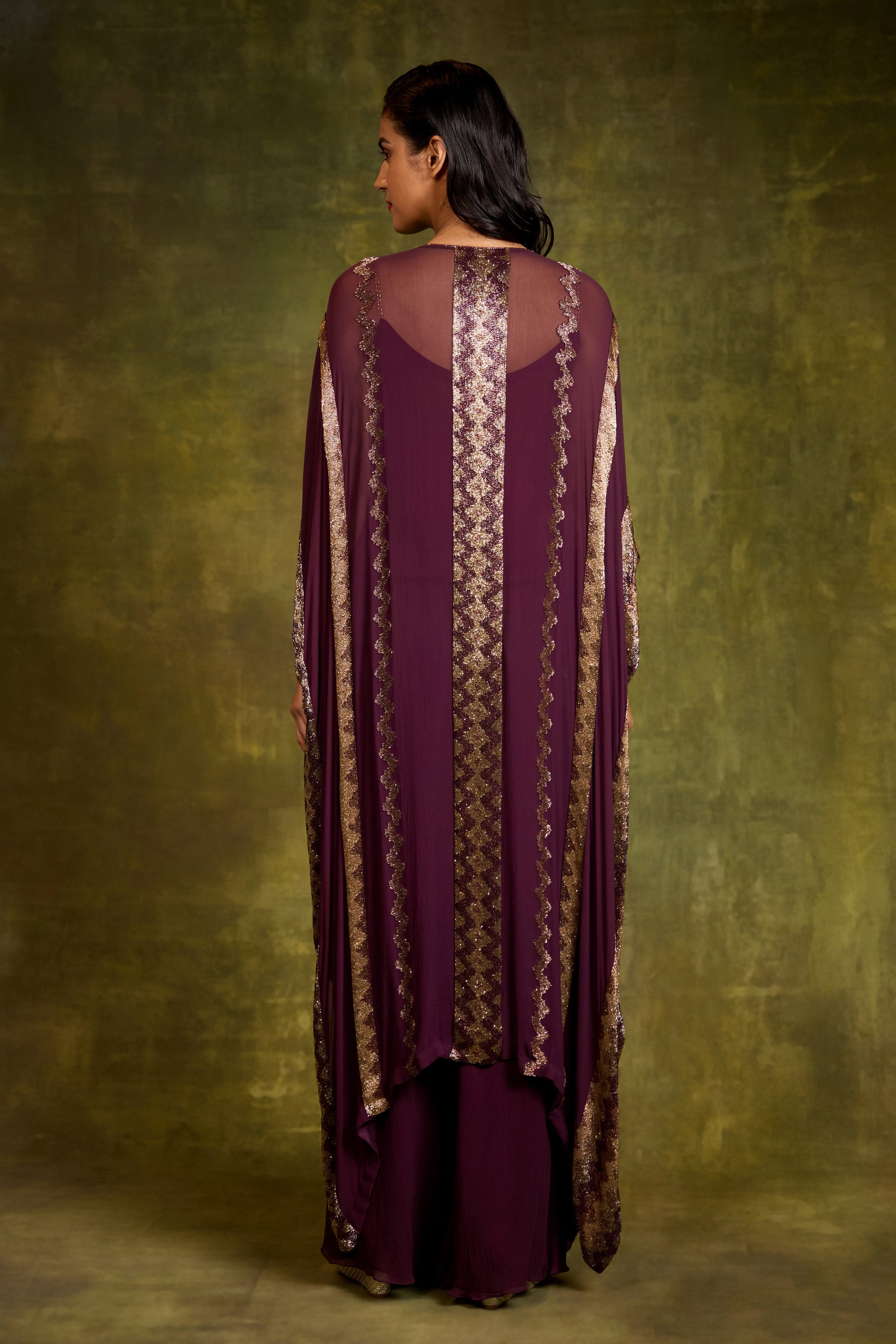A chic kaftan set embellished with intricate cutdana embroidery, creating a refined interplay of texture and shimmer. The fluid silhouette drapes effortlessly, blending comfort with understated glamour, while the detailed embellishments add a luxurious finish—perfect for elegant evenings, festive celebrations, and contemporary occasions.