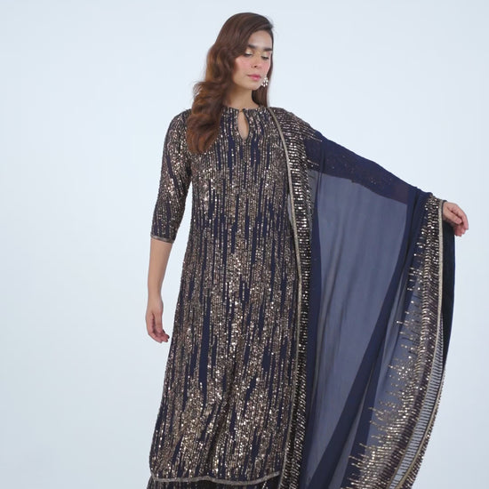Kurta in up down sequin embroidery paired with a farshi palazzo in the same and a plain dupatta with all around border