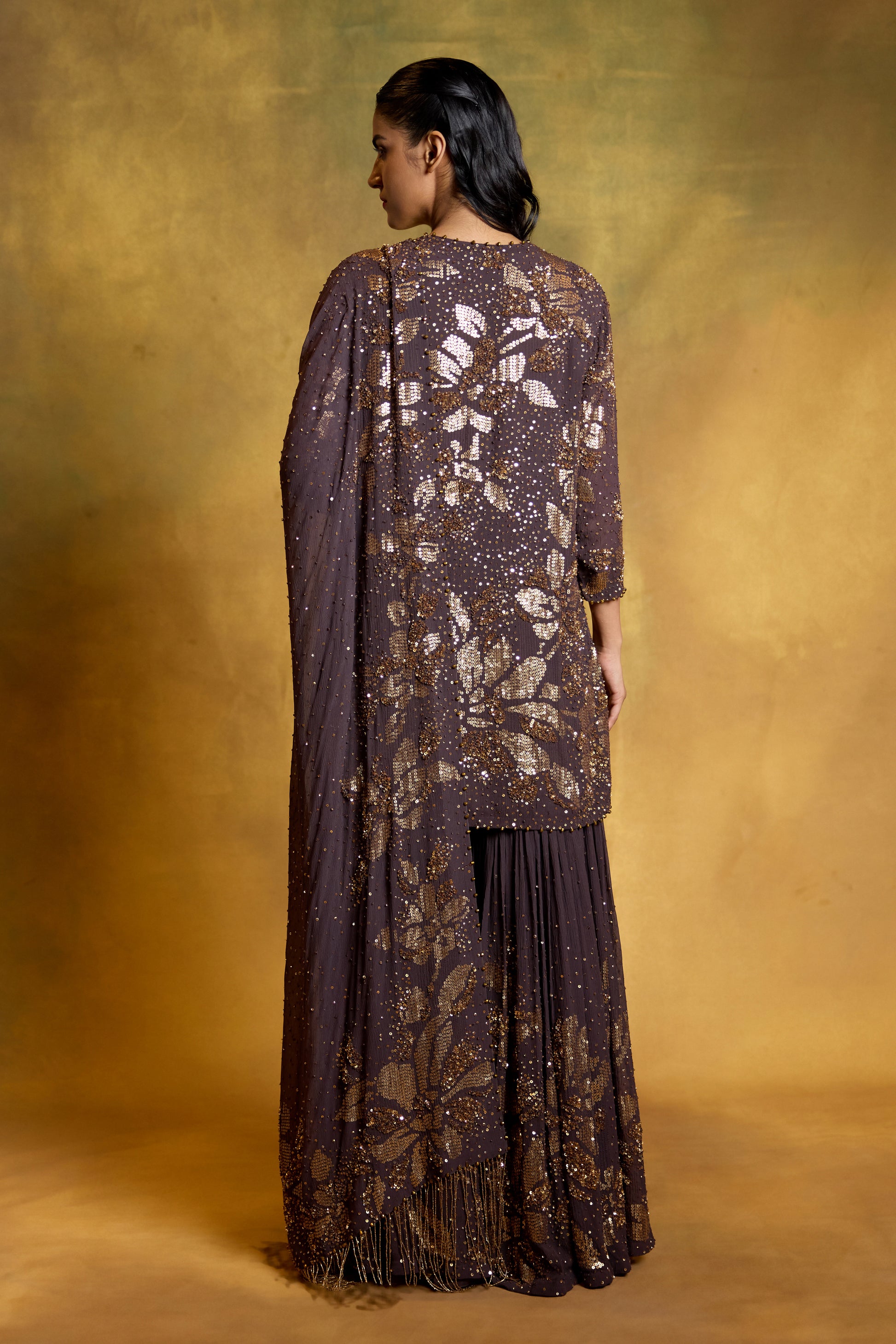 This ensemble features a kurta adorned with floral sprinkle sequin embroidery, paired with a gharara and an embellished dupatta — a perfect harmony of contemporary design and timeless elegance.