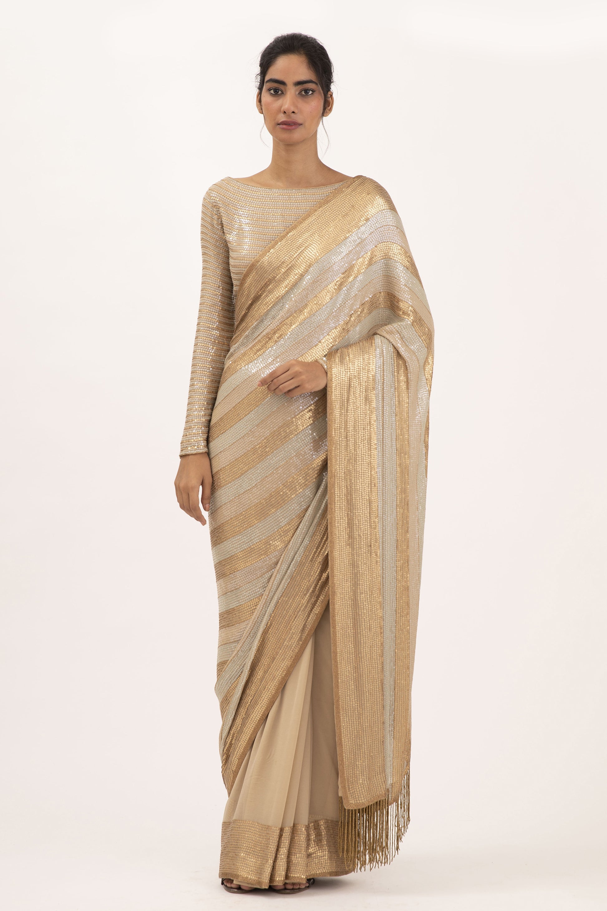 Sari in Striped Sequin pattern embroidery. The look is completed with a intricate sequin matching blouse.