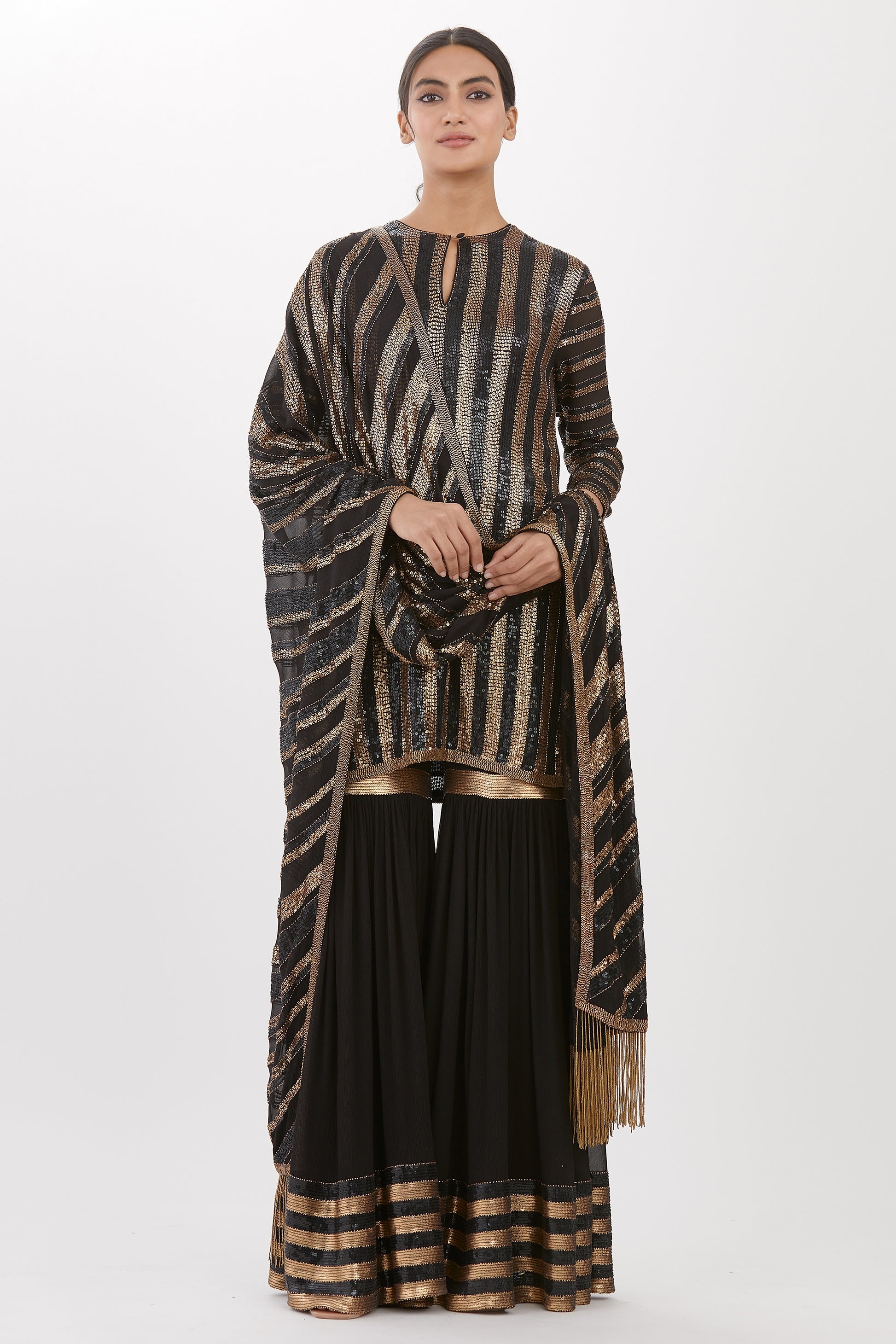 Kurta in striped sequin embroidery paired with a gharara and a stripe dupatta