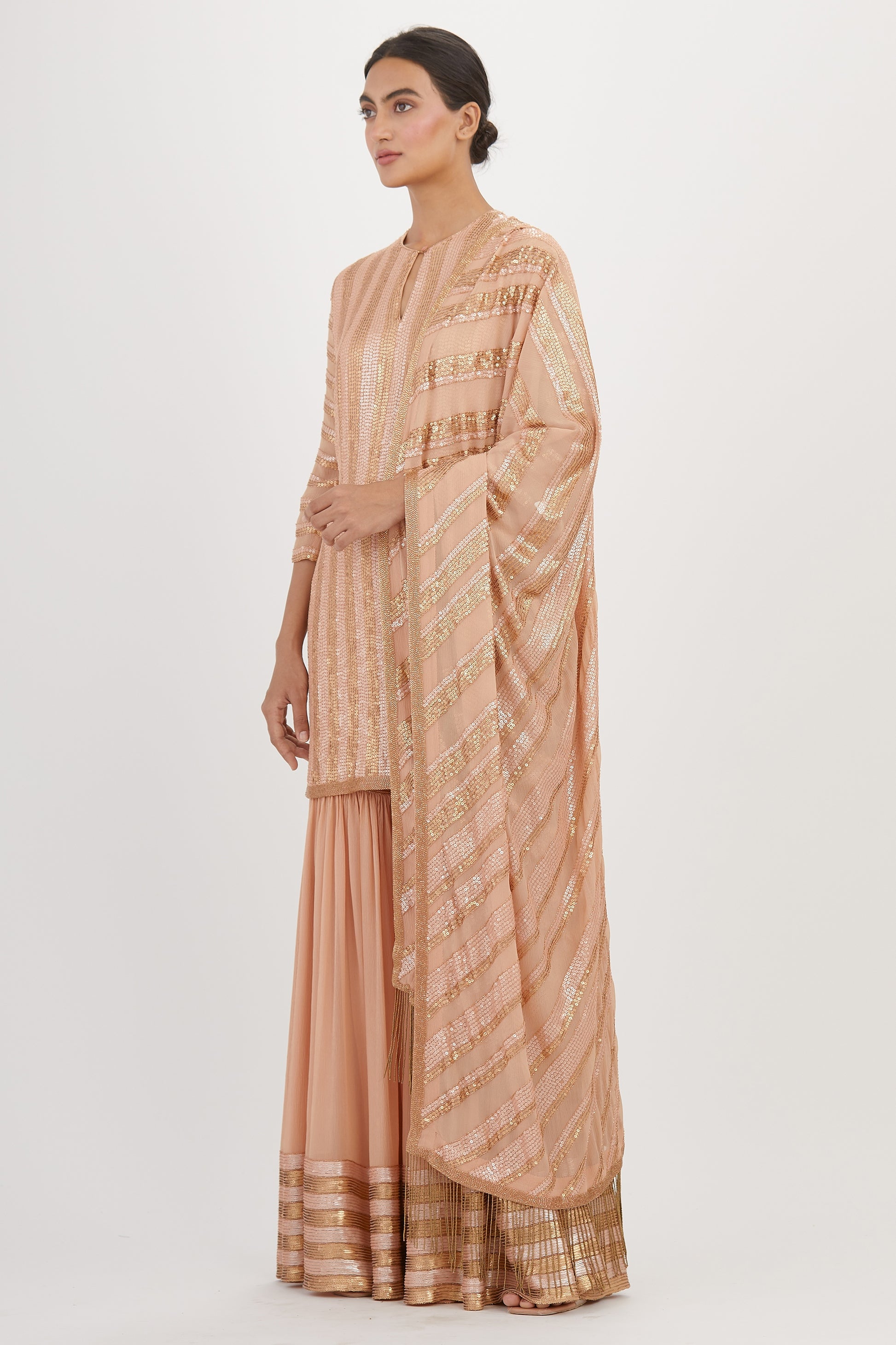 Kurta in striped sequin embroidery paired with a gharara and a stripe dupatta