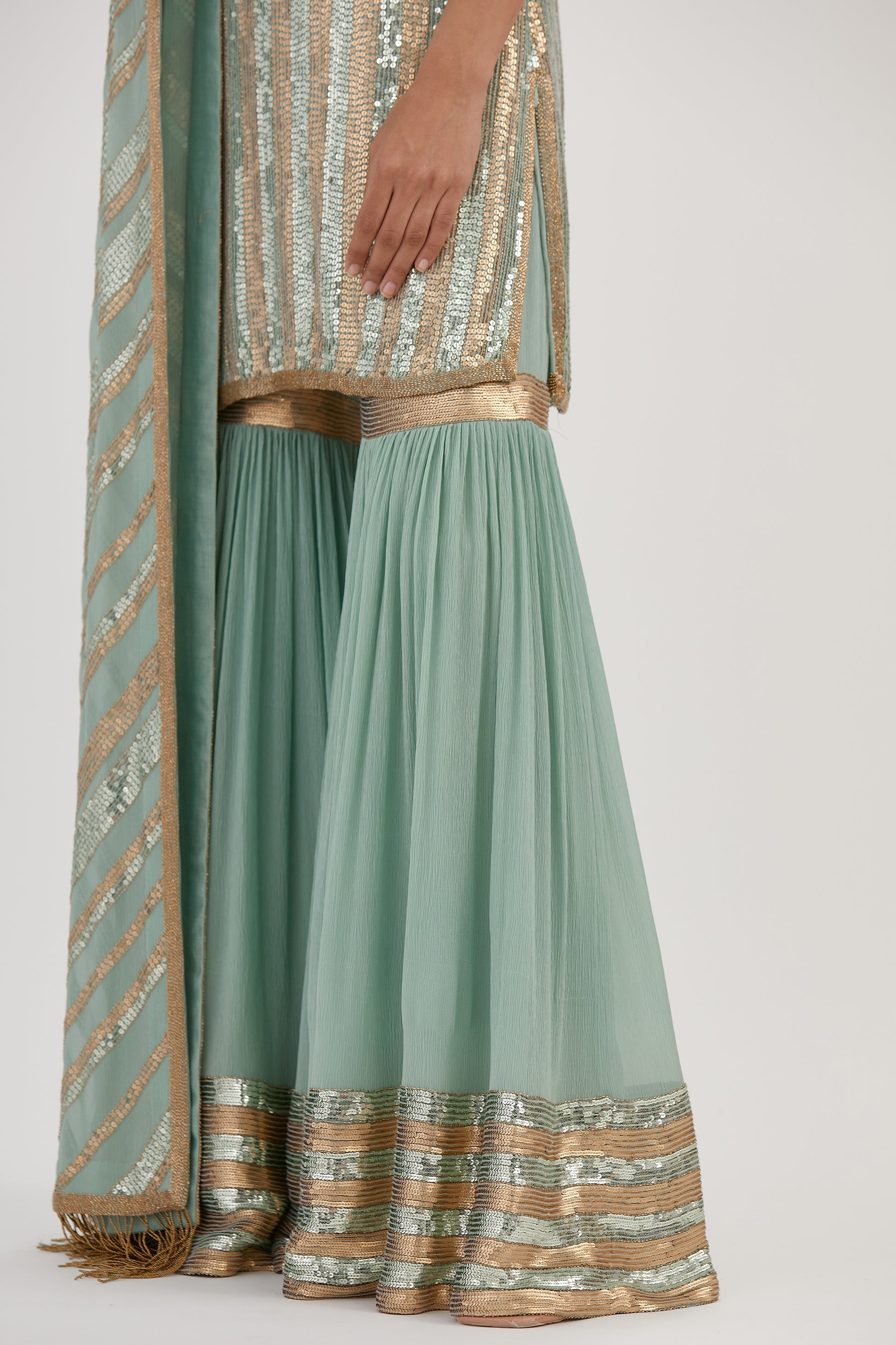 Kurta in striped sequin embroidery paired with a gharara and a stripe dupatta