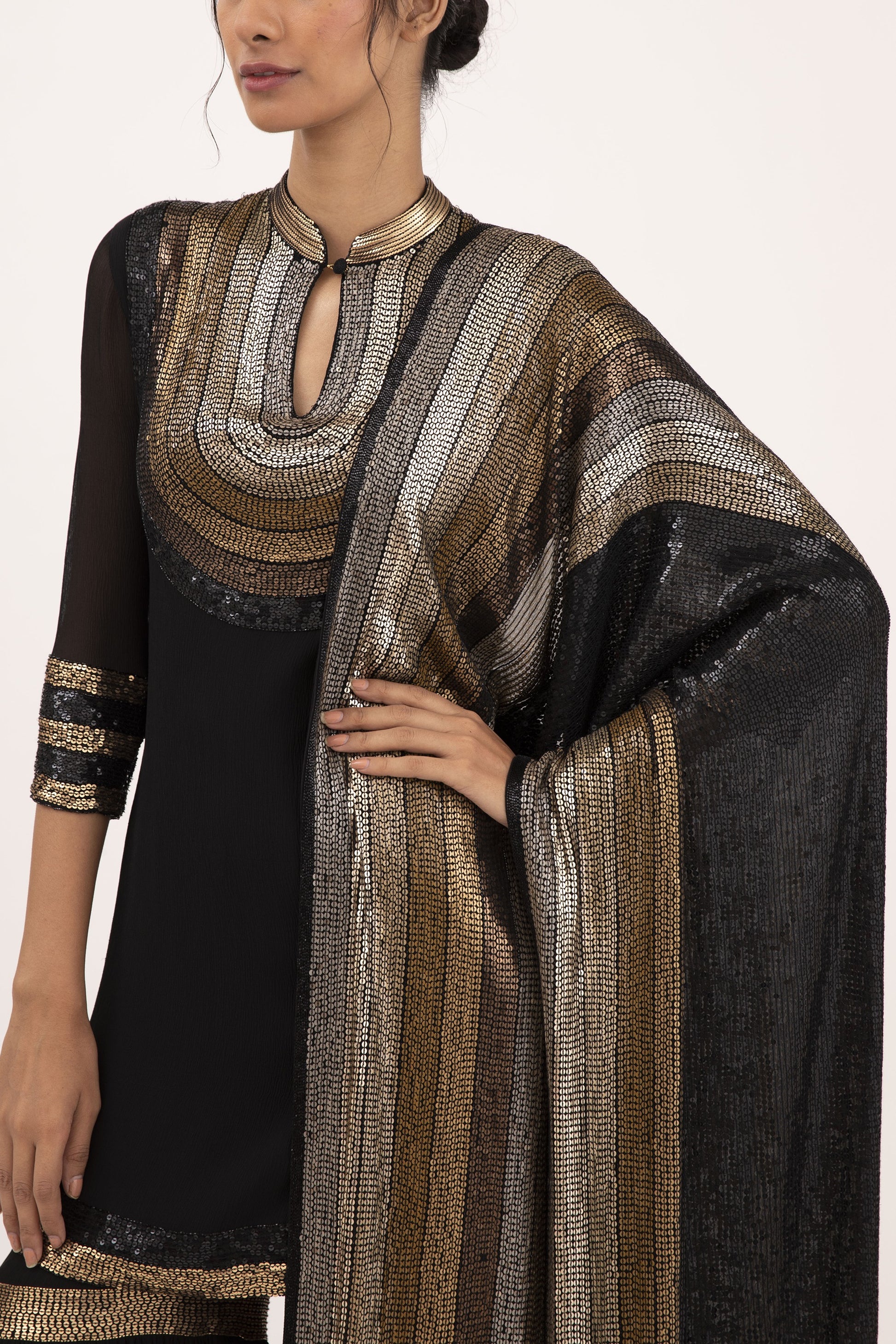 Kurta with Yoke in sequin embroidery paired with a gharara and a sheeted multi stripe dupatta