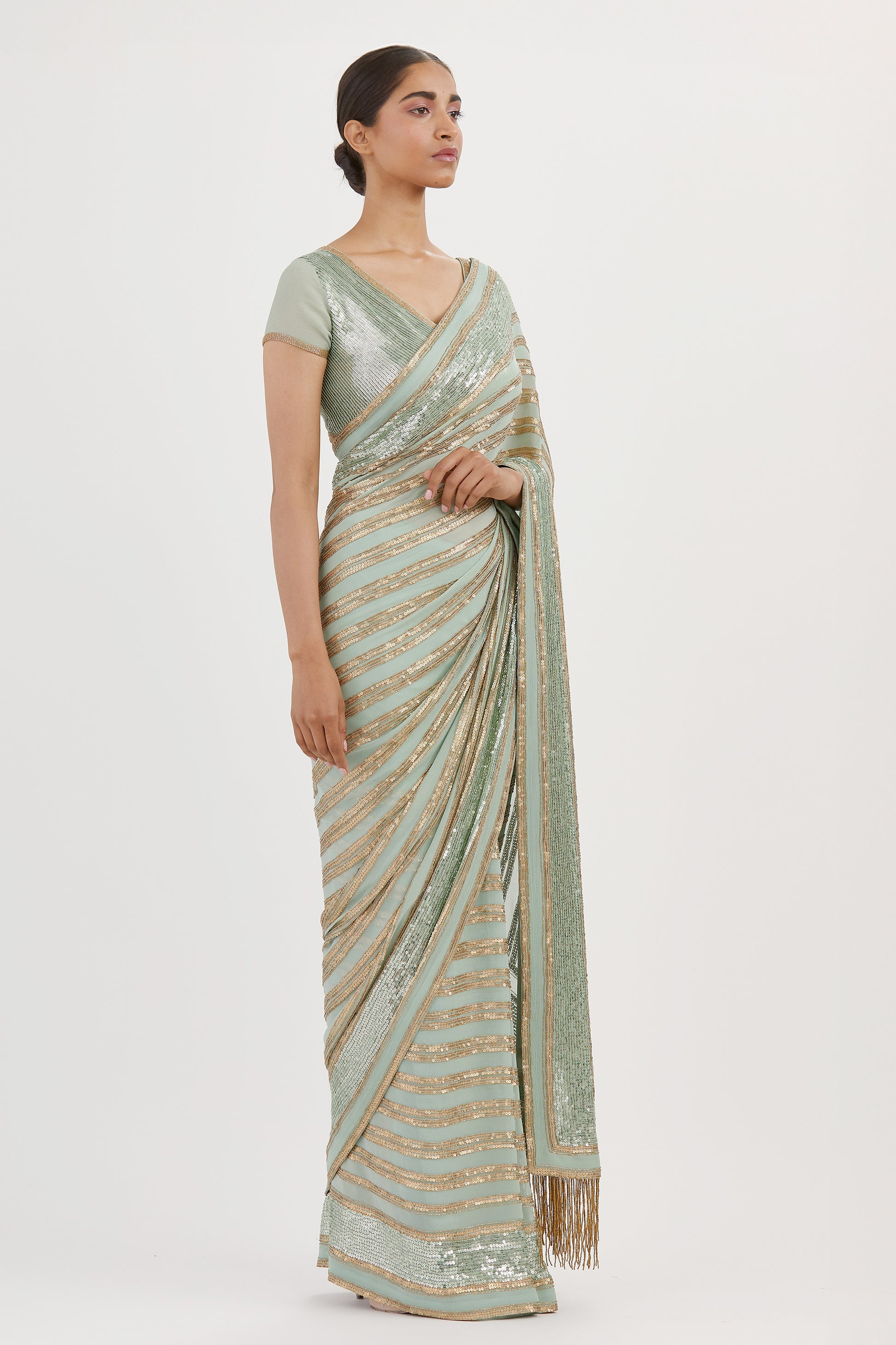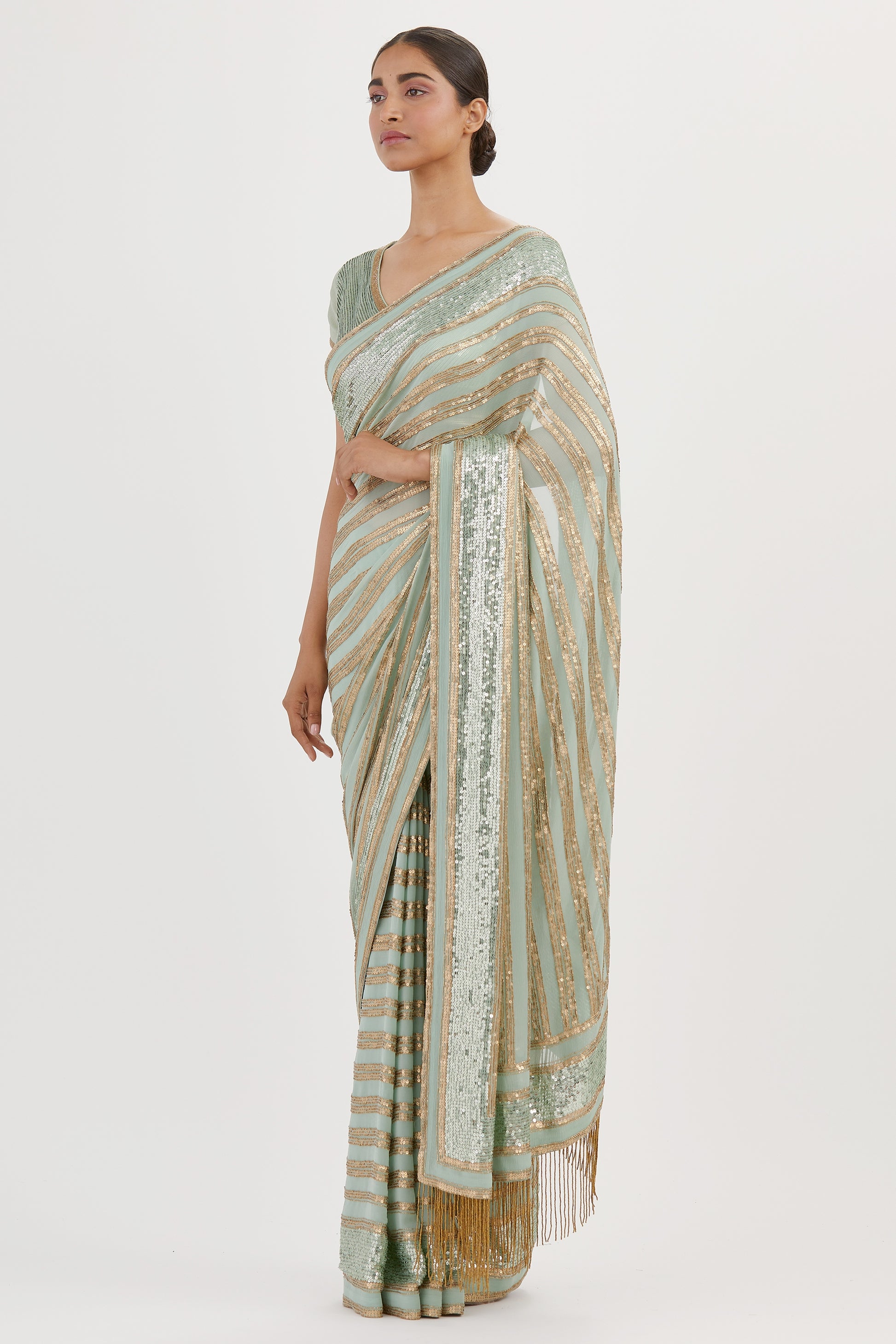 Sari in Striped sheeted Sequin pattern embroidery. The look is completed with a sheeted sequin matching blouse.