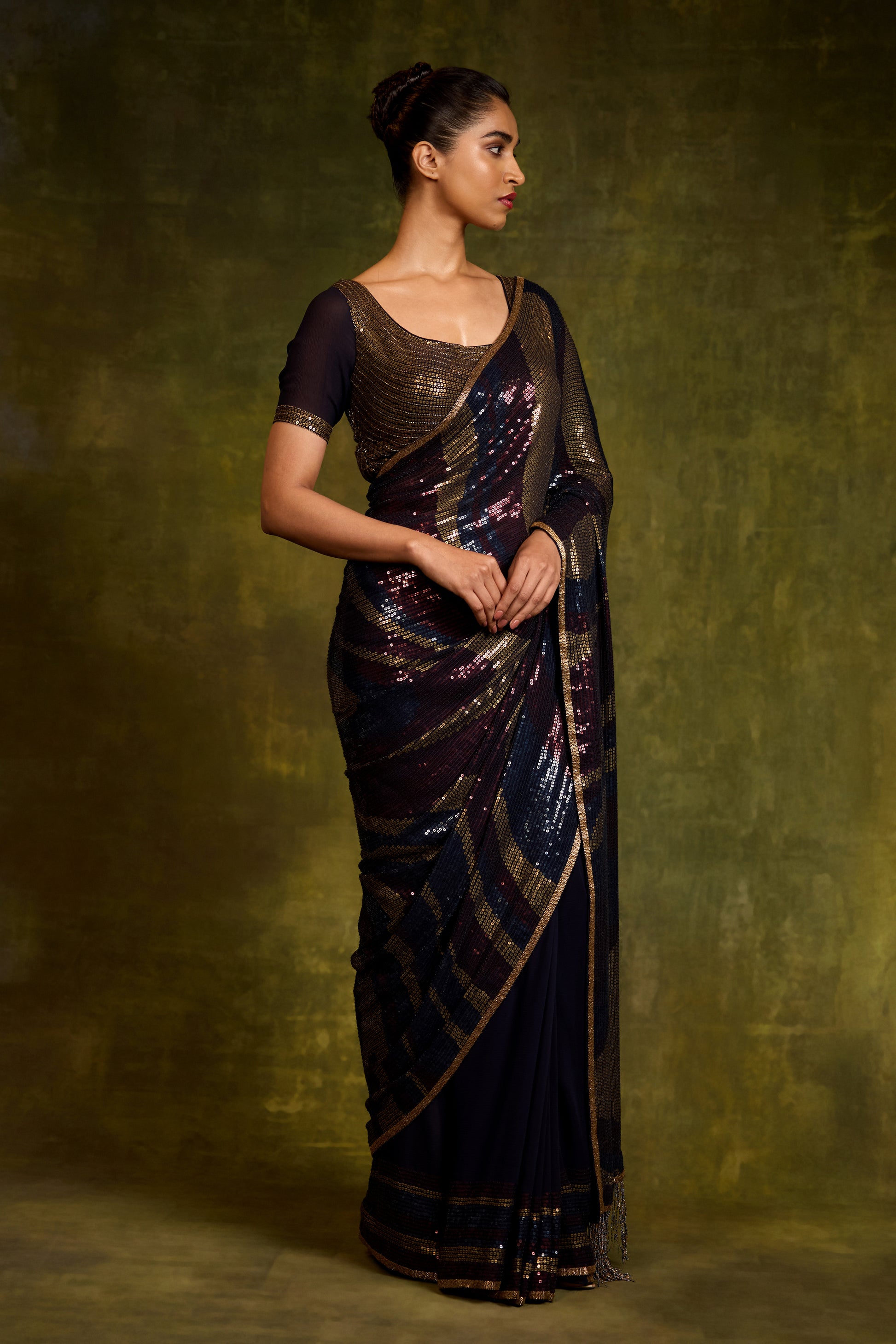 An elegant navy sari featuring a fluid wave-inspired design, brought to life with refined detailing. It is paired with a navy blouse richly embellished in gold sequins, adding a touch of luminous glamour. Sophisticated yet striking, this ensemble is perfect for cocktail evenings, exuding timeless elegance with a modern, after-dark allure.