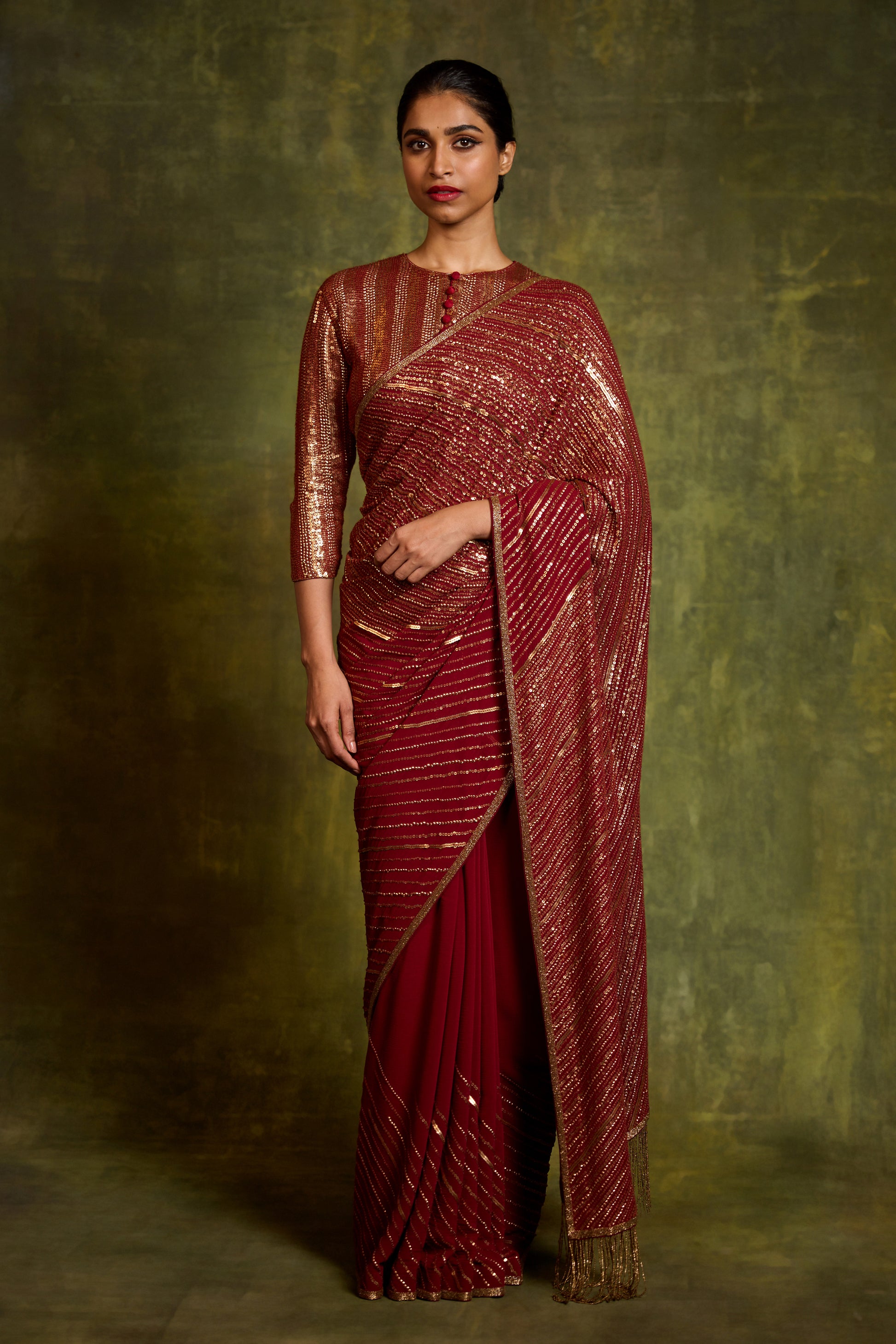 A striking sari adorned with gold sequin embroidery in a diagonal dotted pattern, creating a dynamic play of shimmer and movement. Paired with a striped embroidered blouse, the ensemble blends modern design with festive elegance—bold, contemporary, and effortlessly chic, perfect for celebratory evenings and statement occasions.