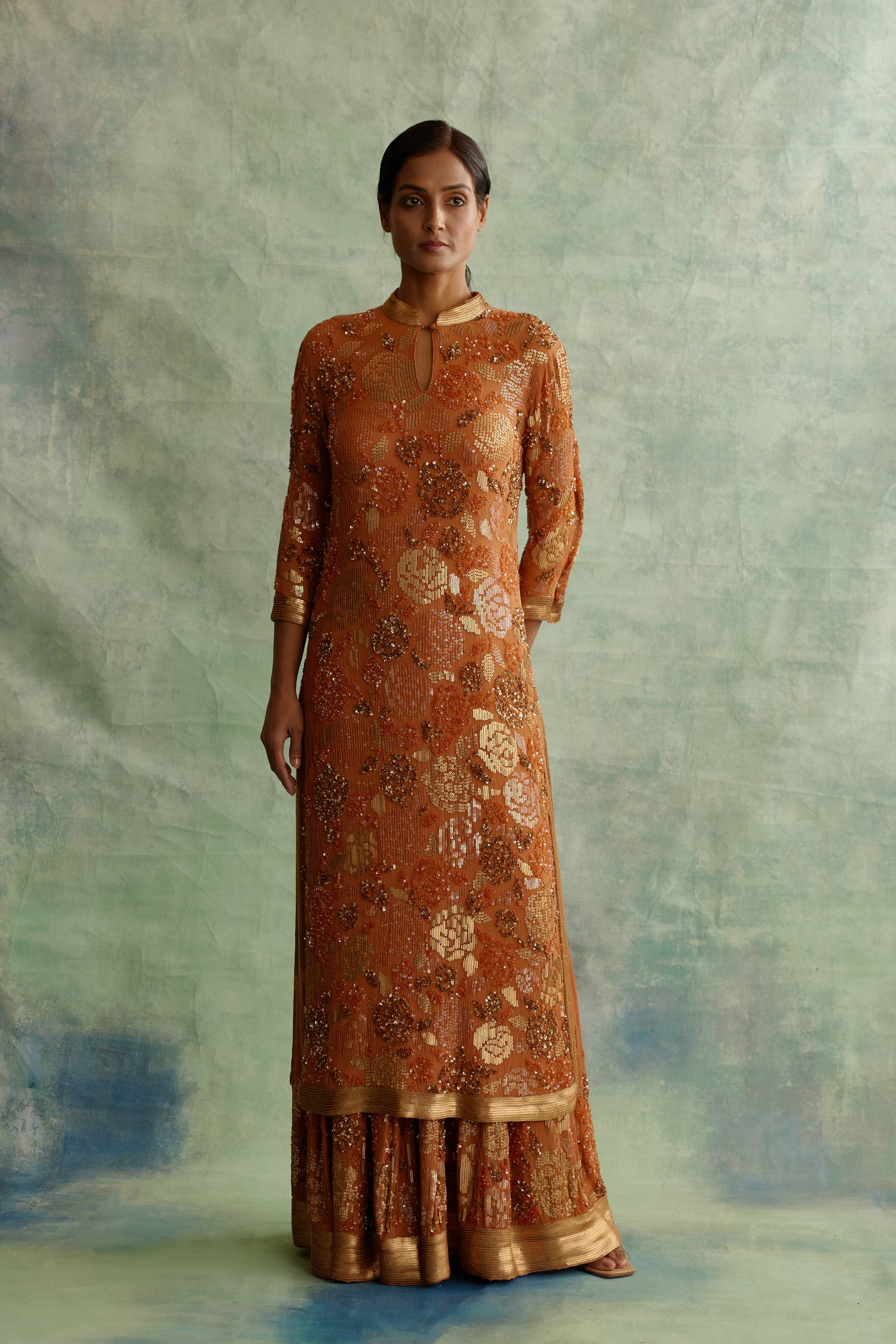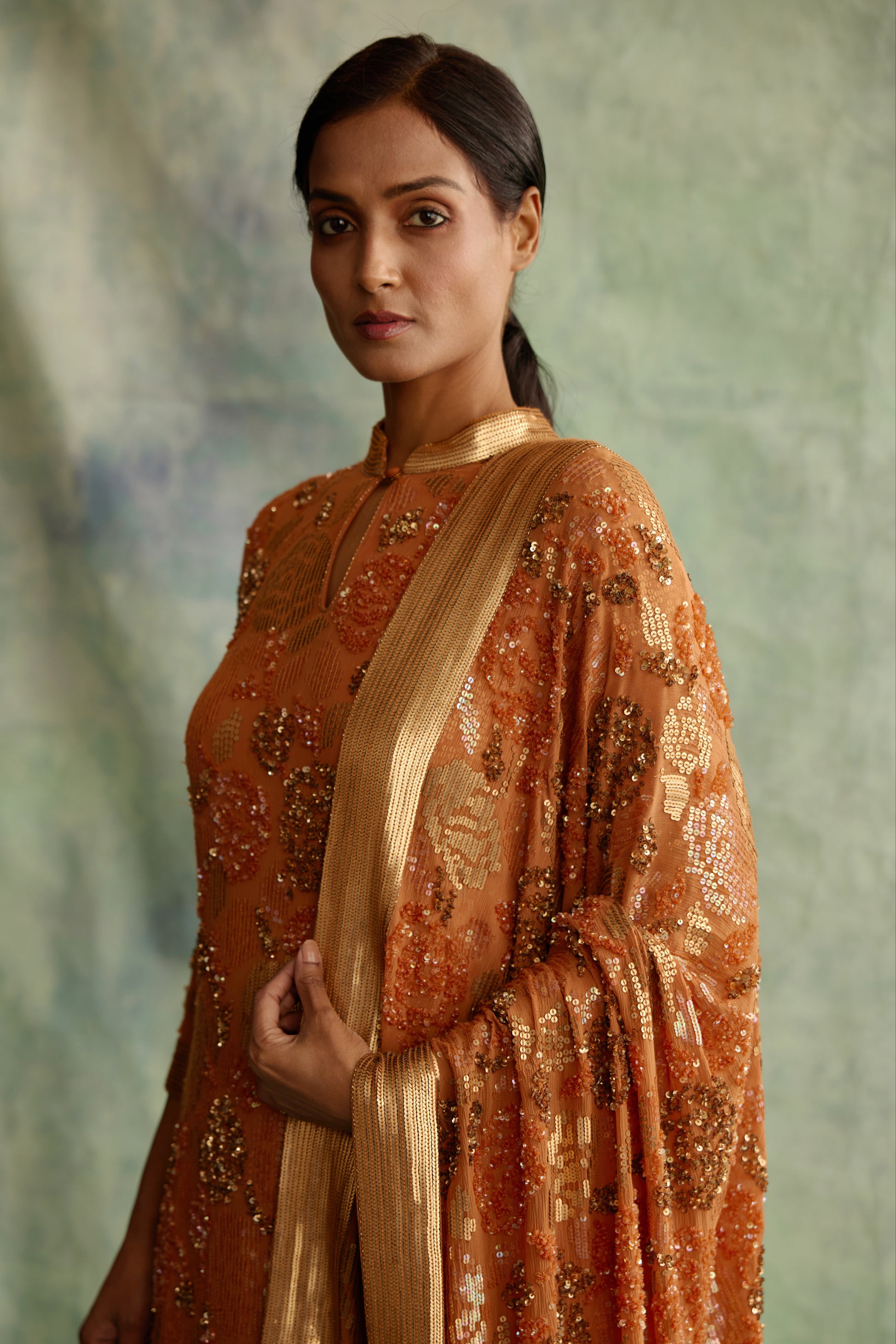 Float in ethereal grace with this signature Rose sequin kurta set featuring a harmonious color tone, perfectly complemented by the dramatic chiffon skirt and dupatta