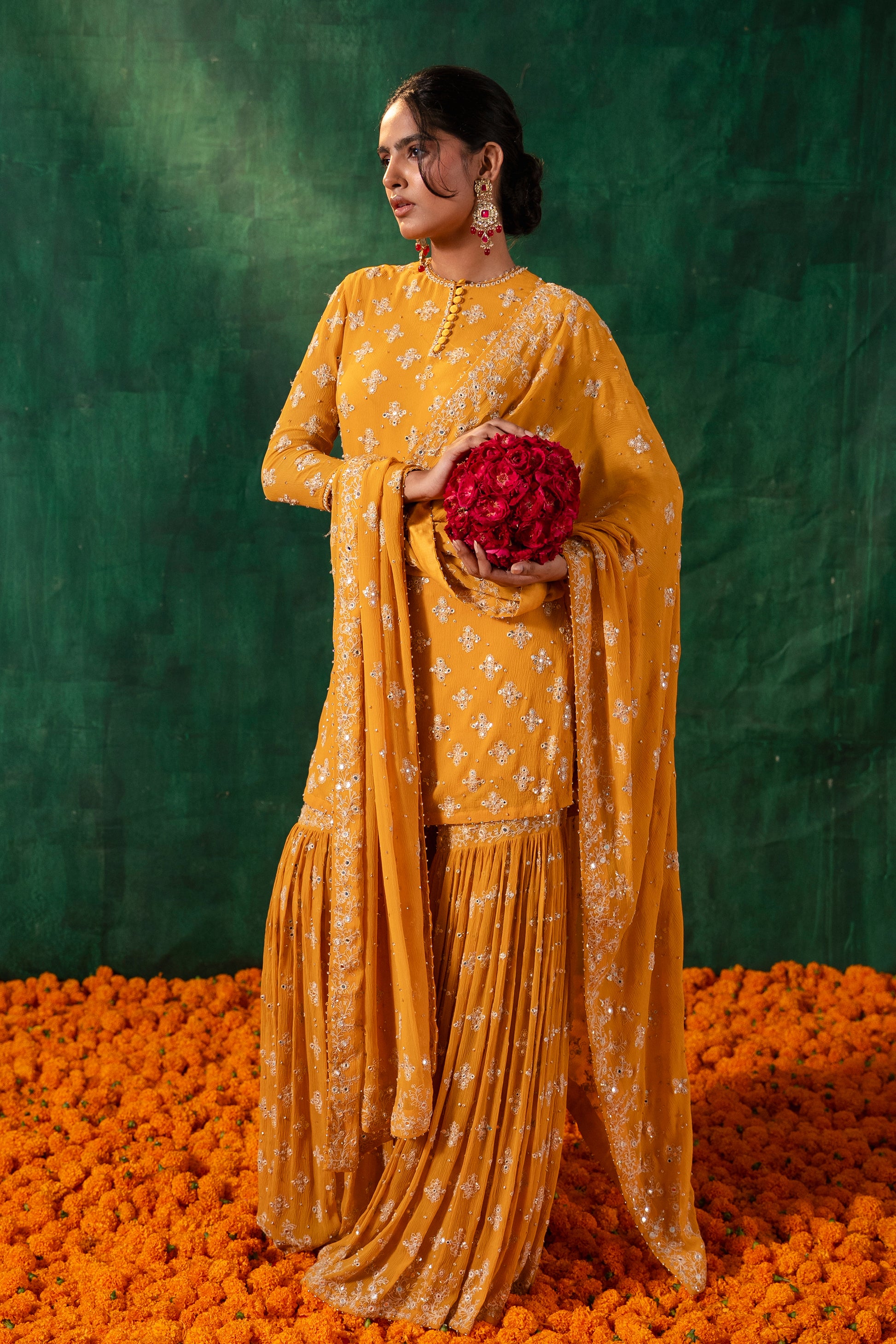 Kurta, Gharara and Dupatta in ivory thread and tiny mirrors embroidery