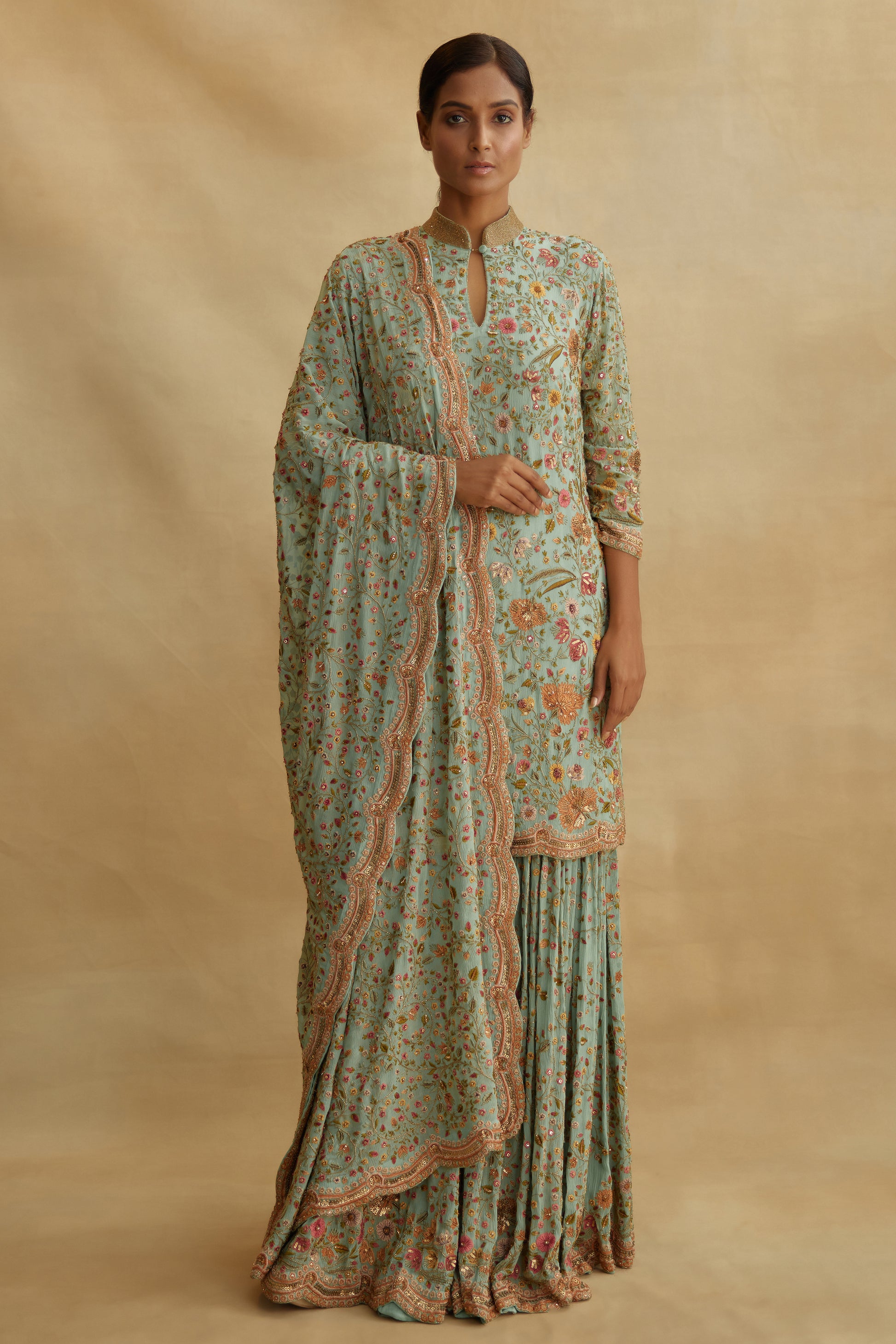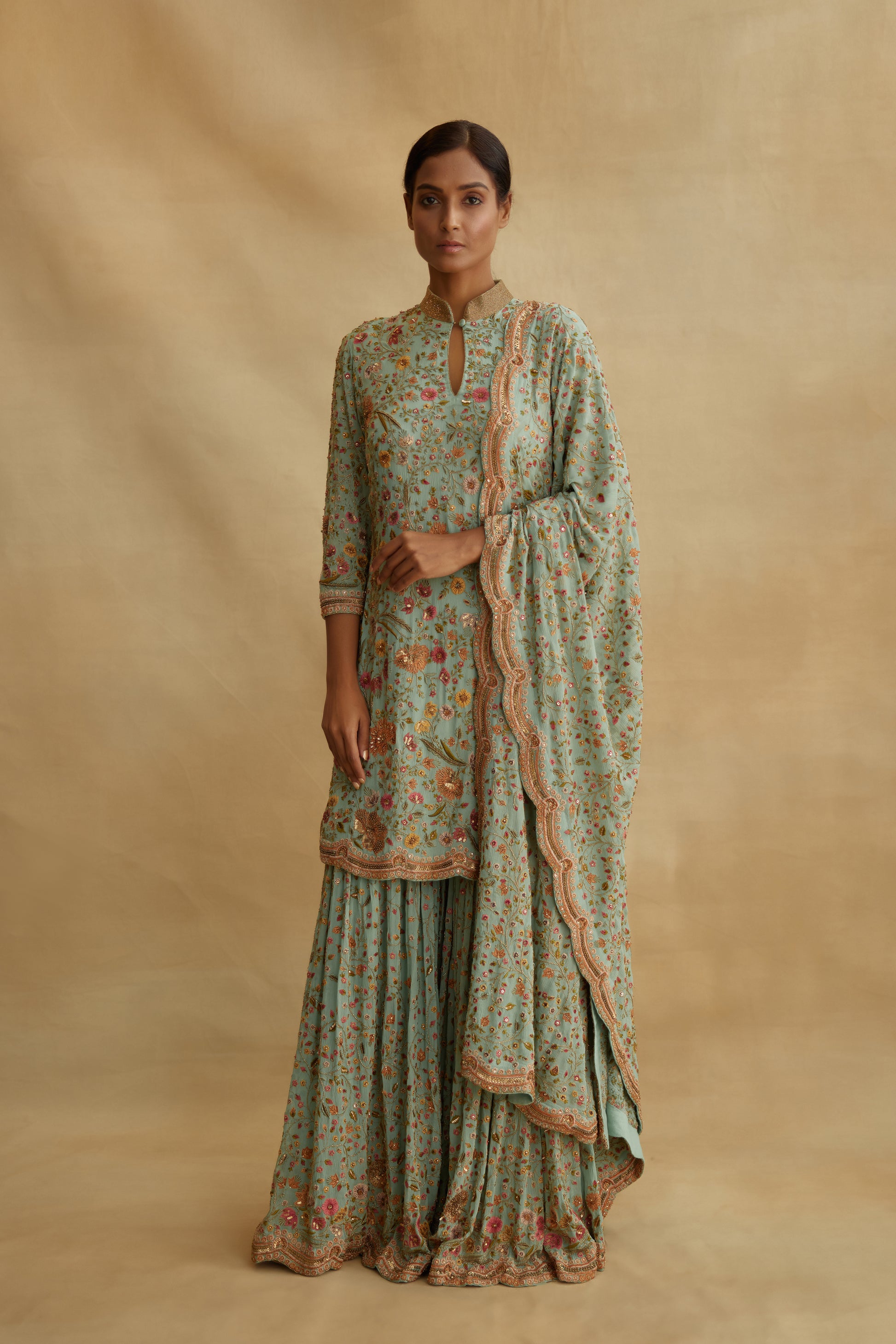 Kurta and Gharara in an intricate floral embroidery paired with a dupatta with scalloped border