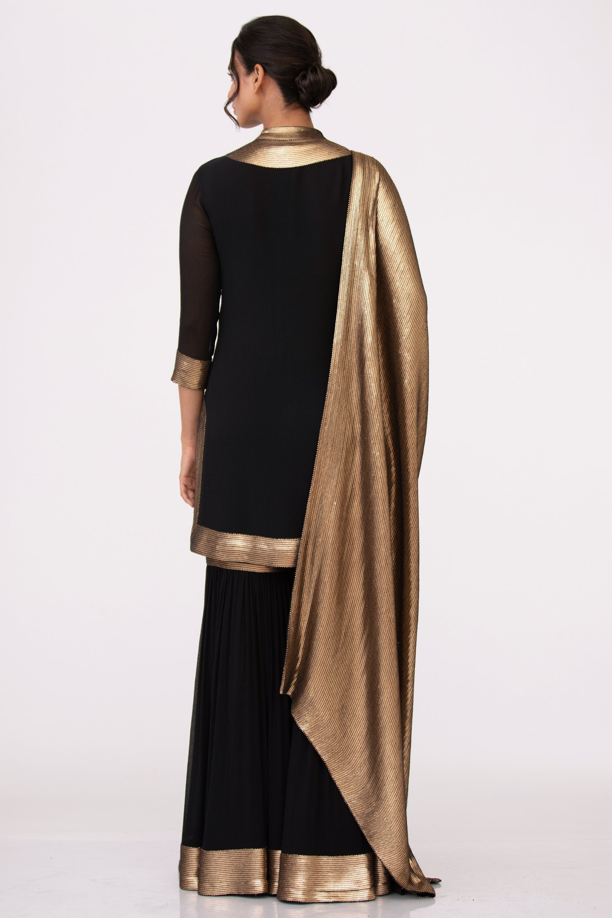 Kurta, Gharara in gold sequin embroidery in black paired with a gold sequin sheeted dupatta