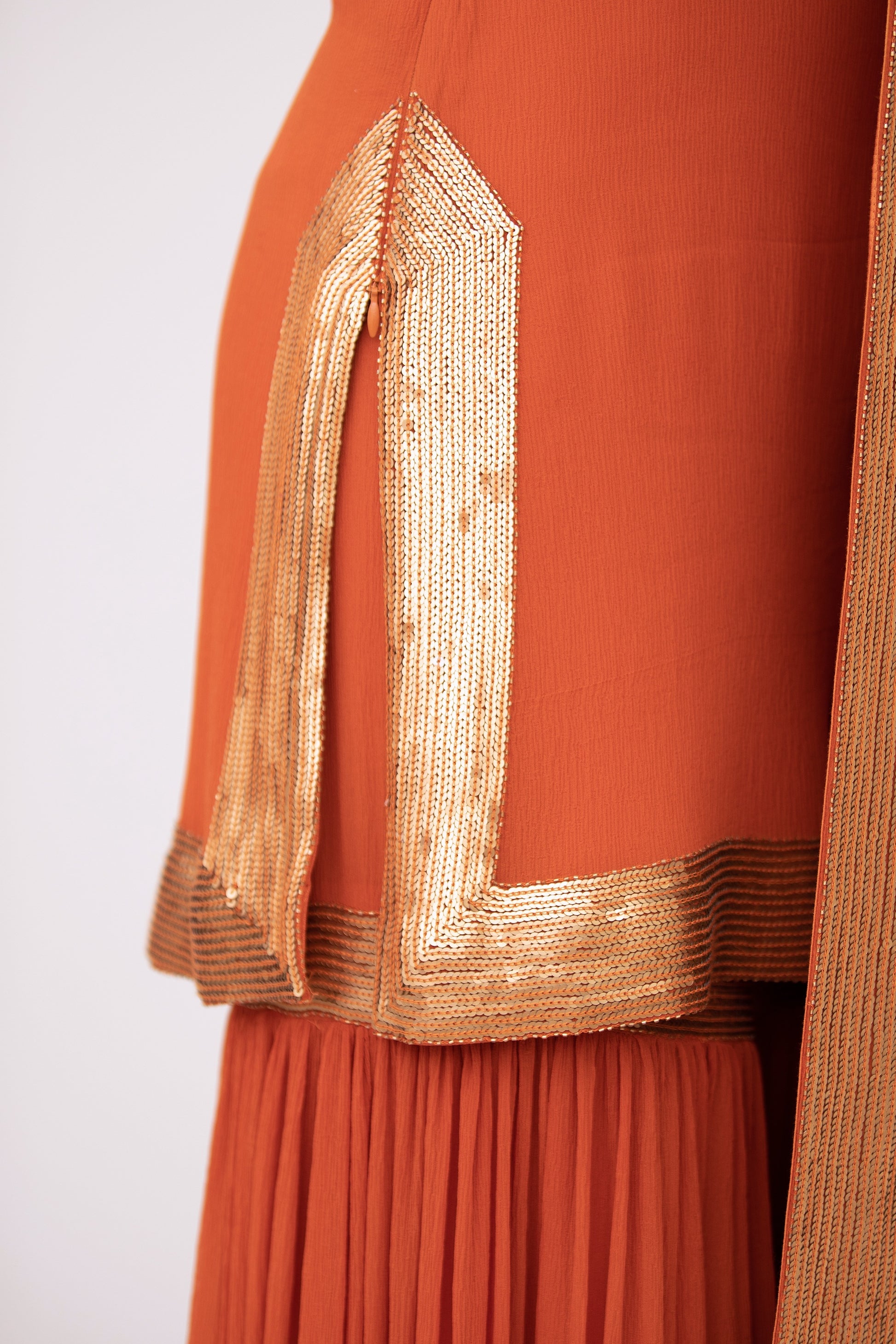 Kurta, Gharara in gold sequin embroidery in Mandarin Orange paired with a gold sequin sheeted dupatta