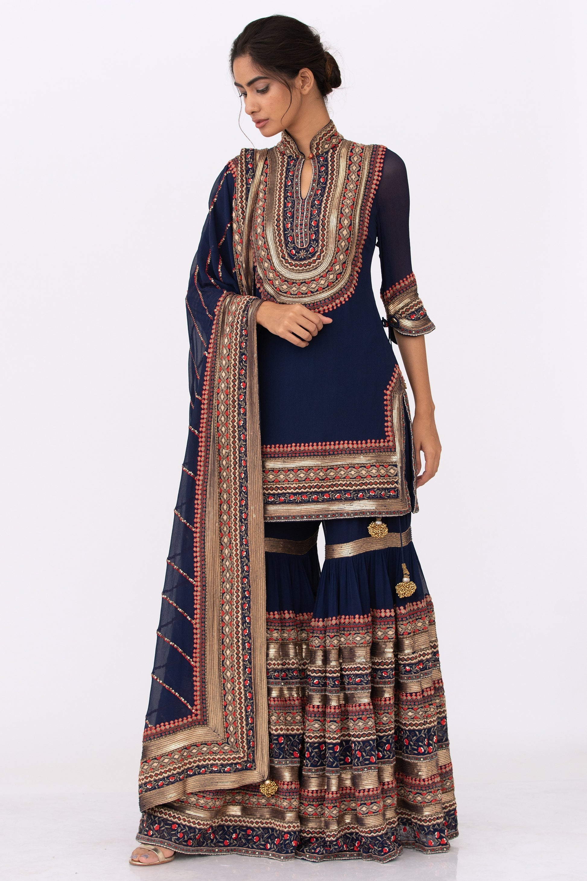 Gharara , Kurta and Dupatta in our tribal thread embroidery highlighted with gold sequins
