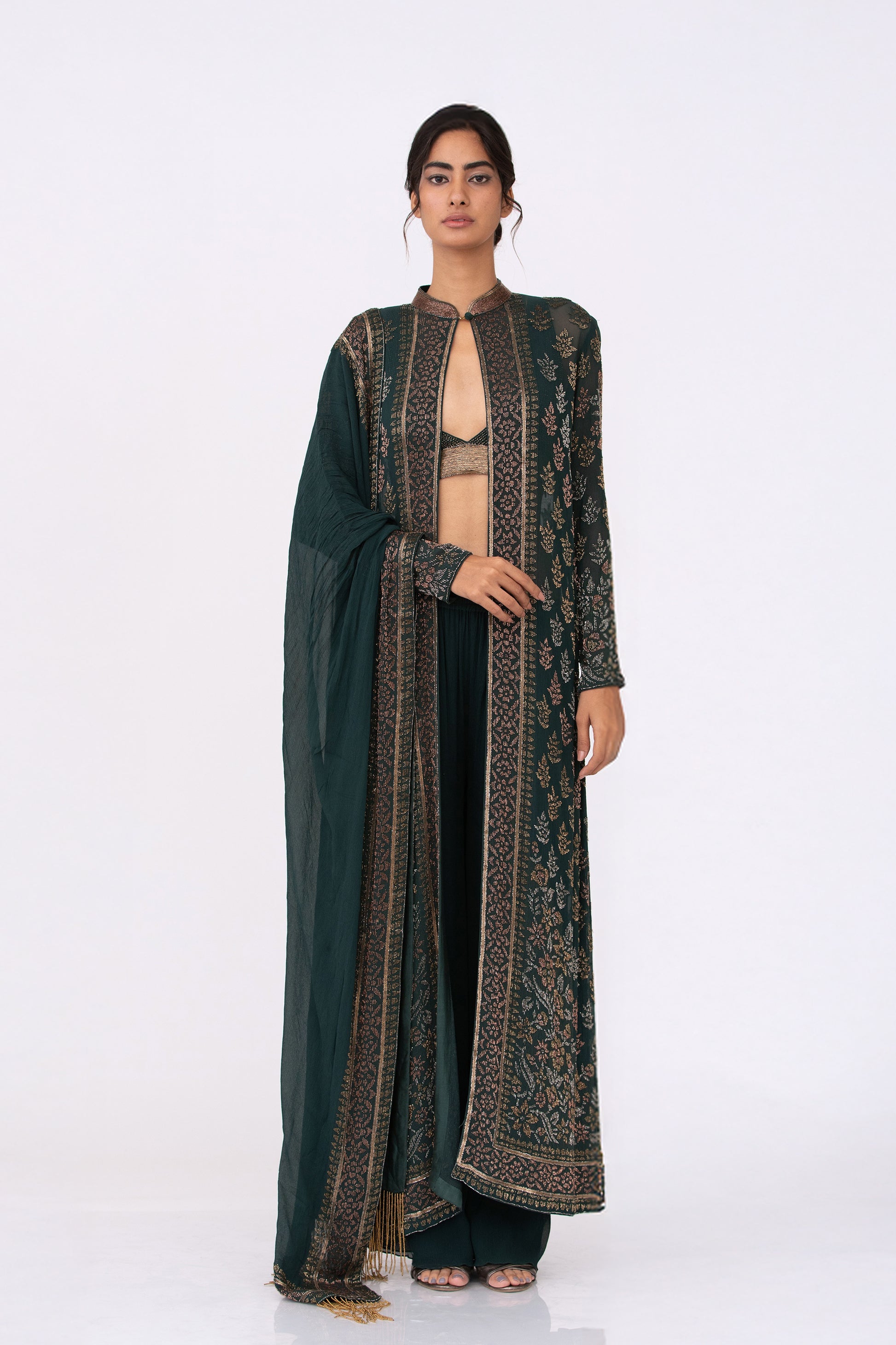 Jacket in spiral beadwork embroidery and paired with a embroidered blouse and dupatta and matched with palazzos