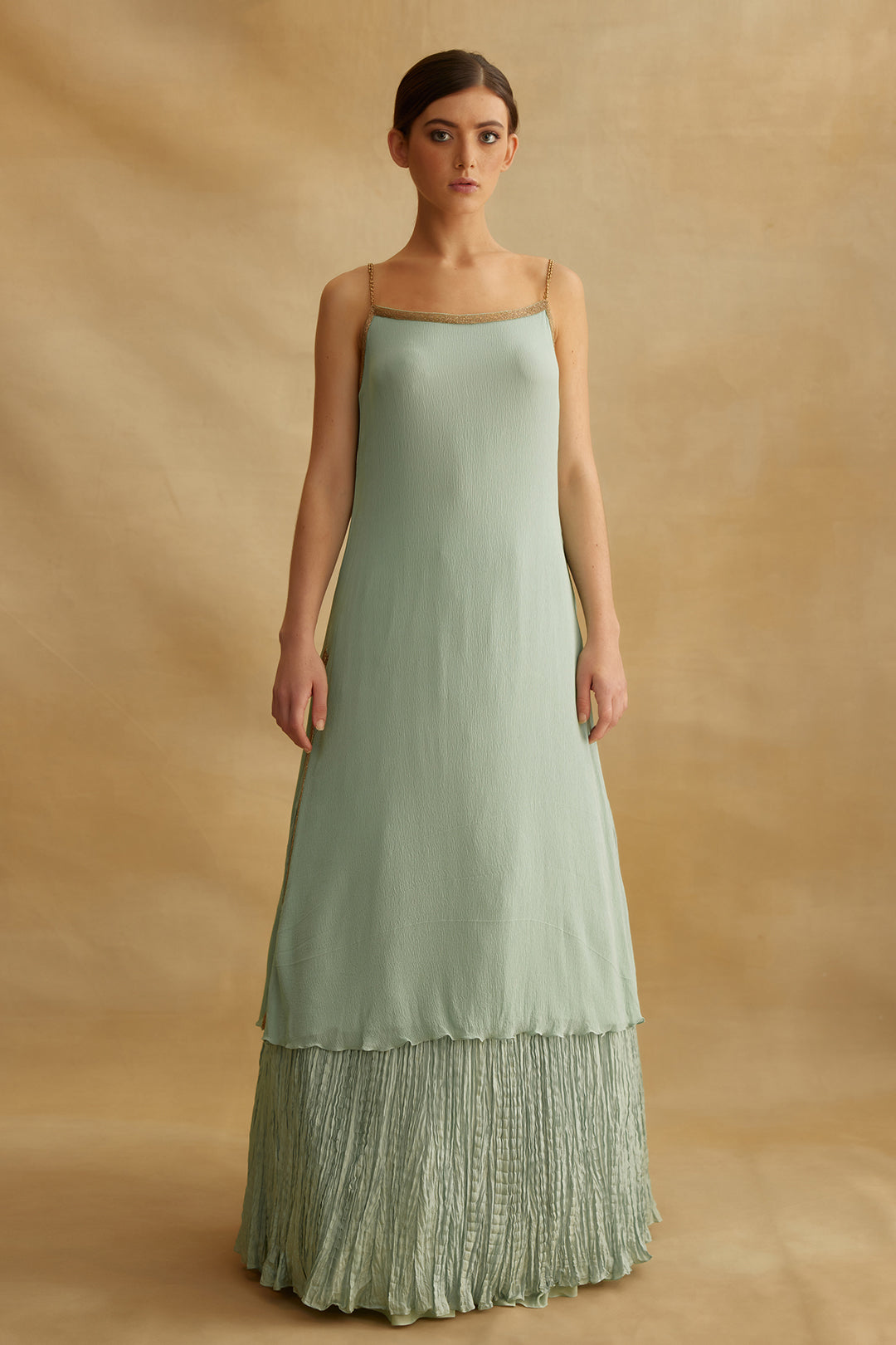 Jacket and Dupatta in floral Multi thread embroidery. The look is completed with a gold sheeted inner and chiffon skirt with three inch gold border