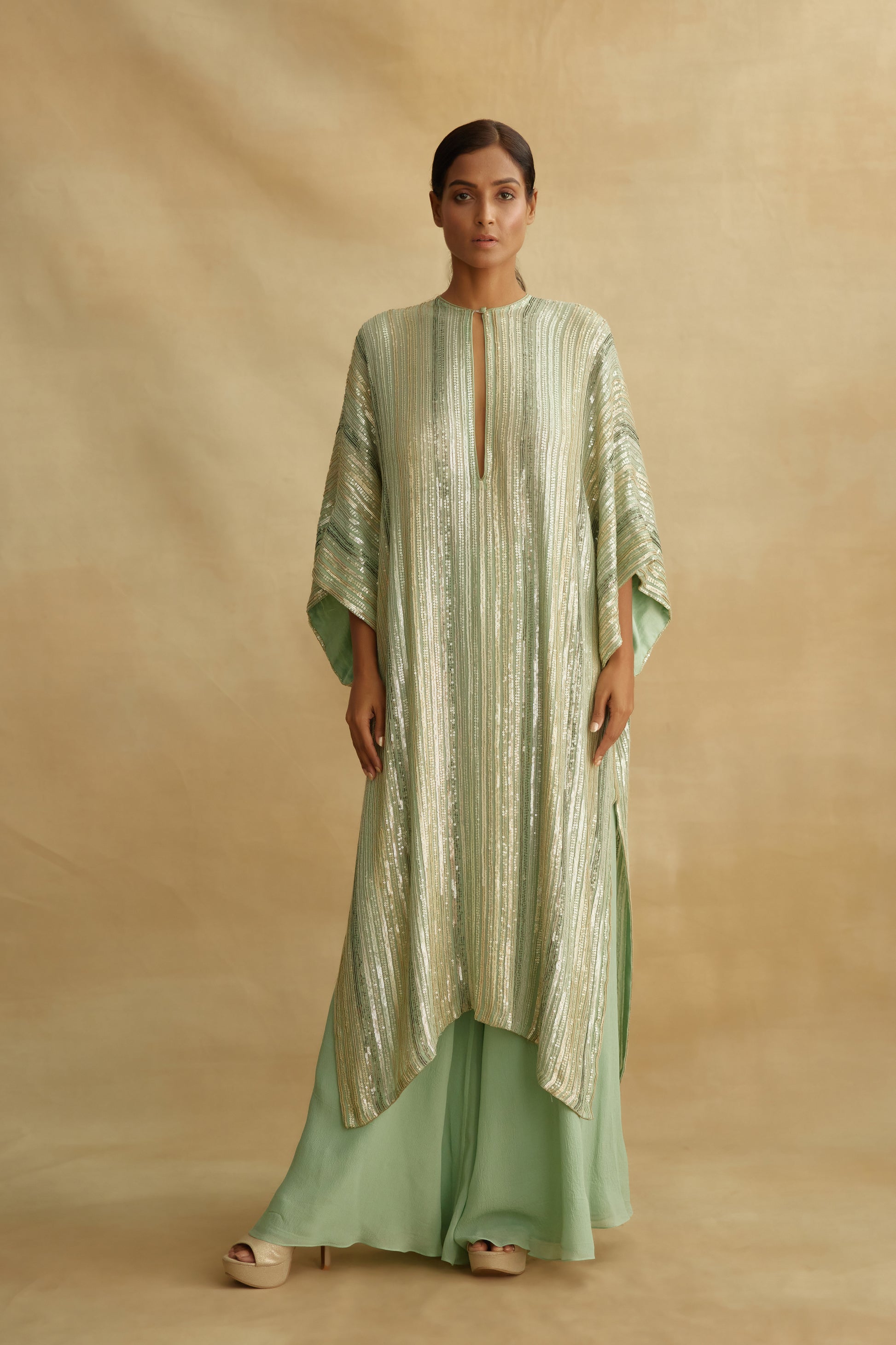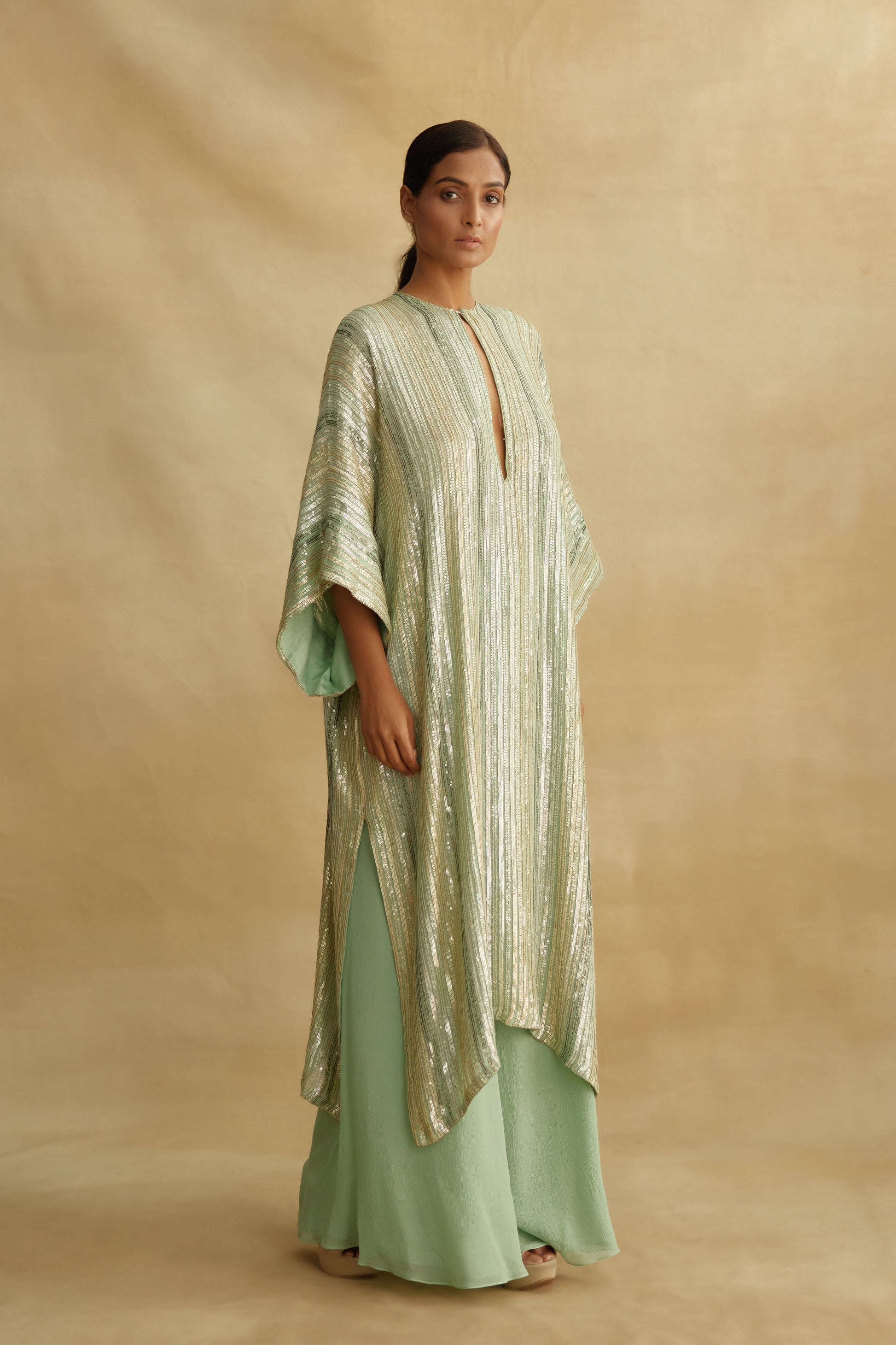 Kaftan in mix small sequin embroidery on sleeves and base paired with straight chiffon palazzos