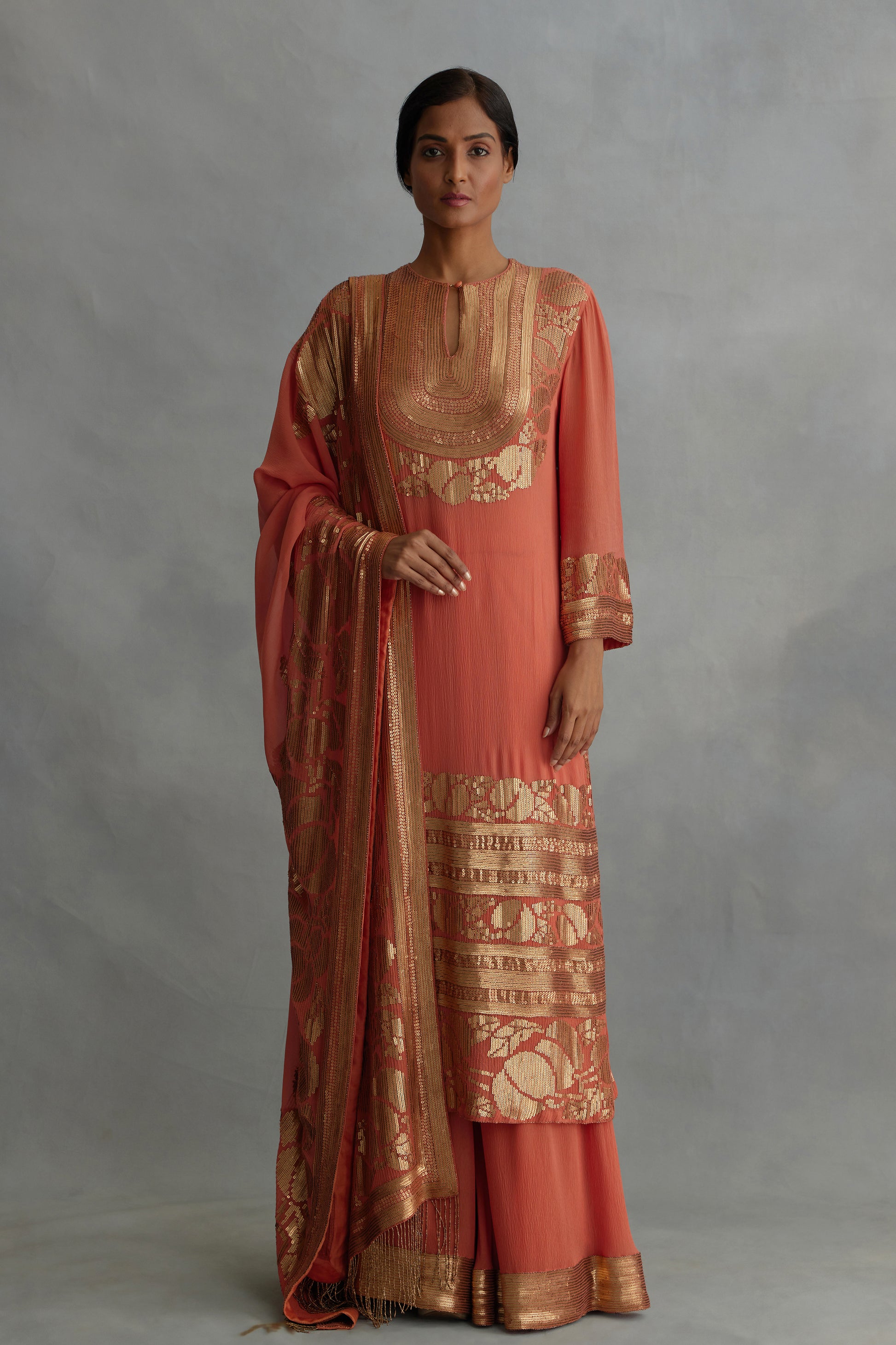 Kurta and Dupatta in berry design sequin embroidery paired with palazzos with gold sequin border