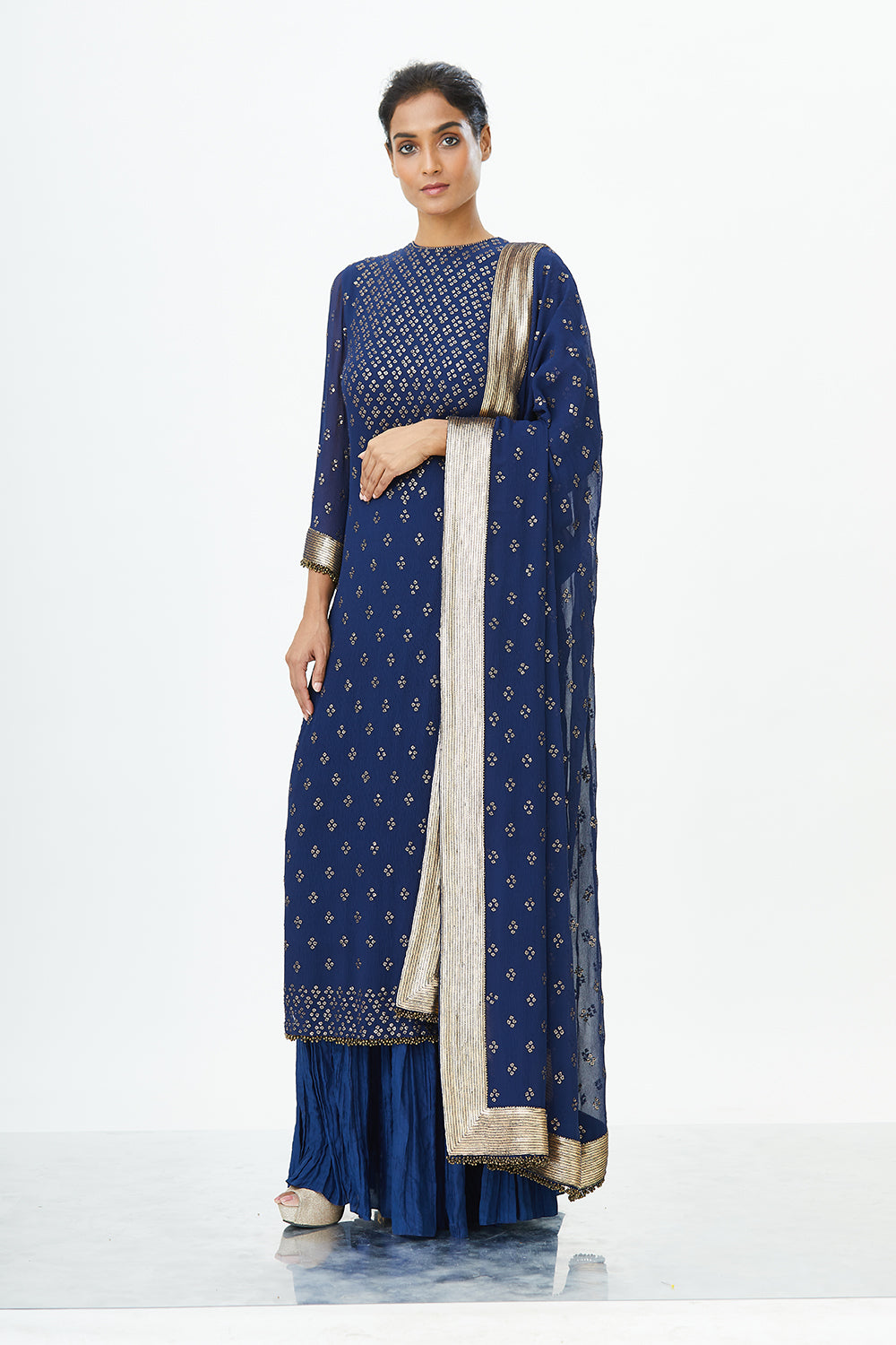 Kurta and dupatta in bandini inspired sequins embroidery paired with crinkled silk skirt.