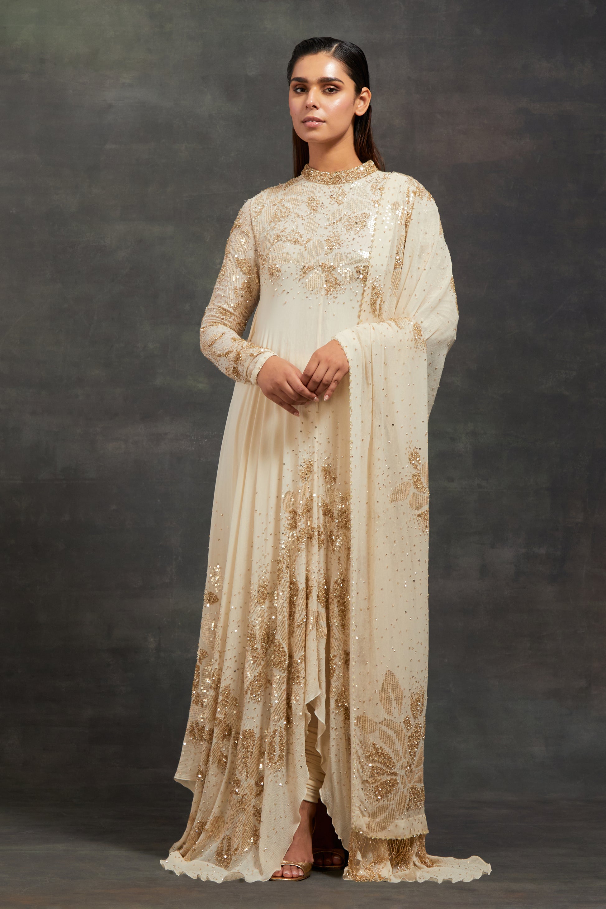 This ensemble features an asymmetric kurta adorned with floral sprinkle sequin embroidery, paired with a churidaar pant and an embellished dupatta — a perfect harmony of contemporary design and timeless elegance.