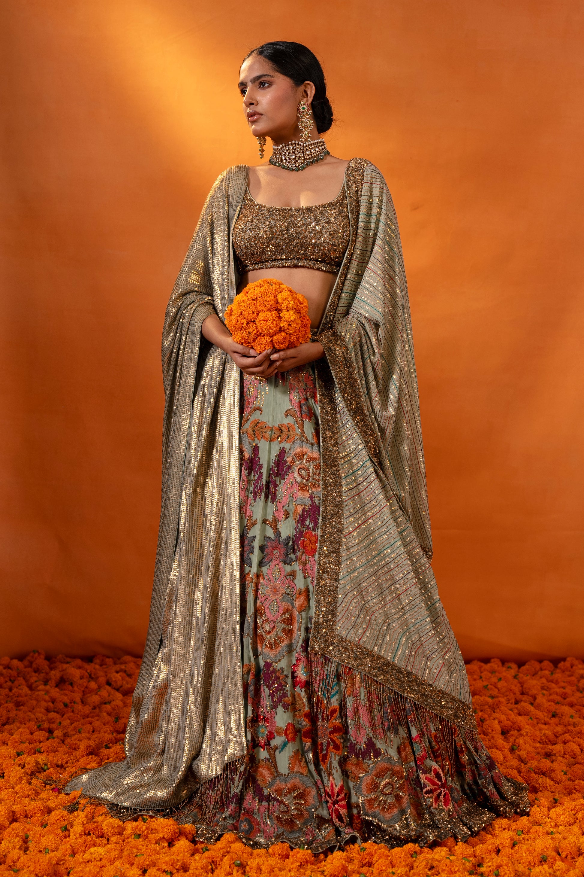 Lehenga in floral ikkat thread embroidery with a sequin blouse and can be paired with either gold sheeted dupatta or thread embroidered dupatta