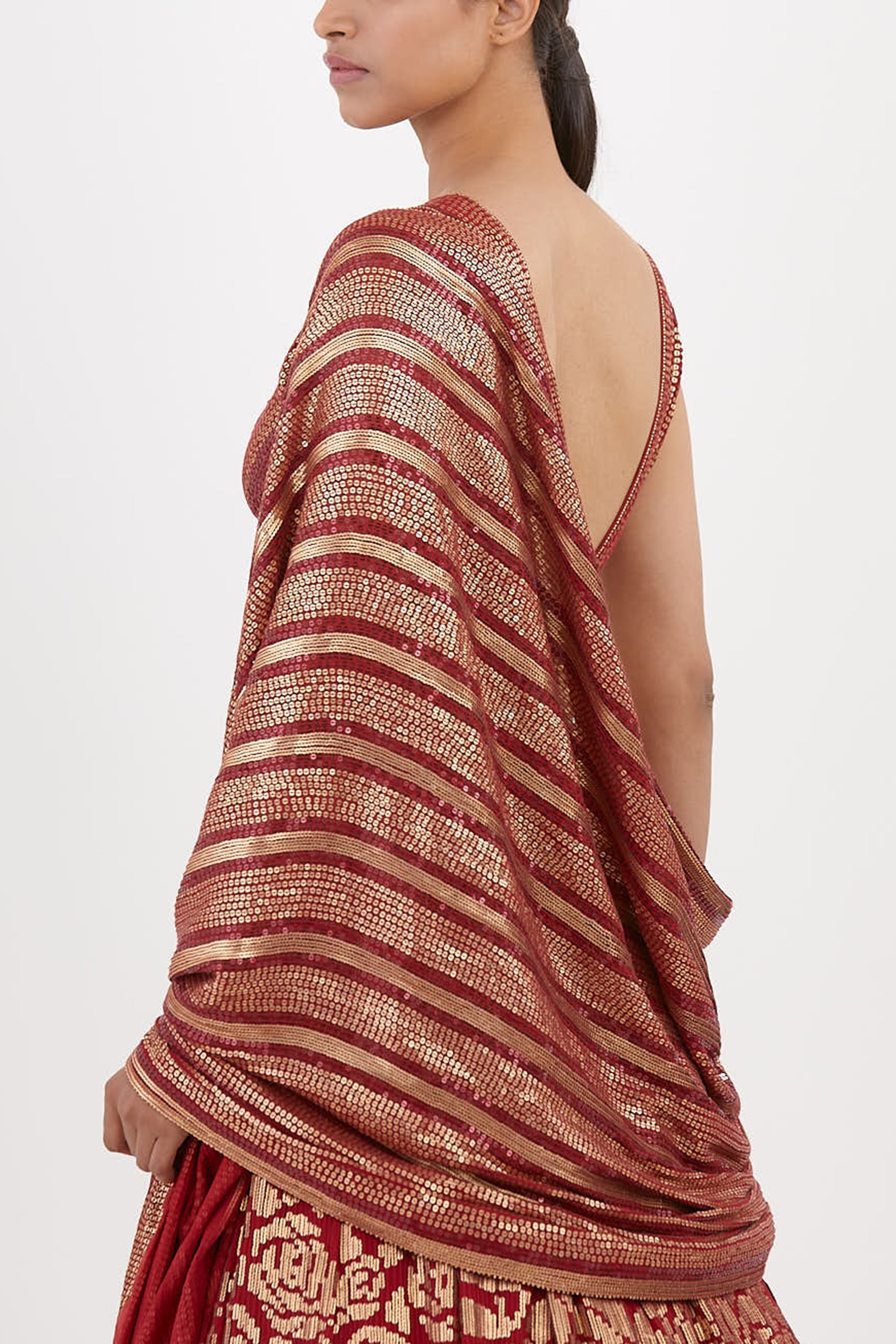 Lehenga and Blouse in signature roses in gold sequin embroidery paired with a stripe blouse and dupatta