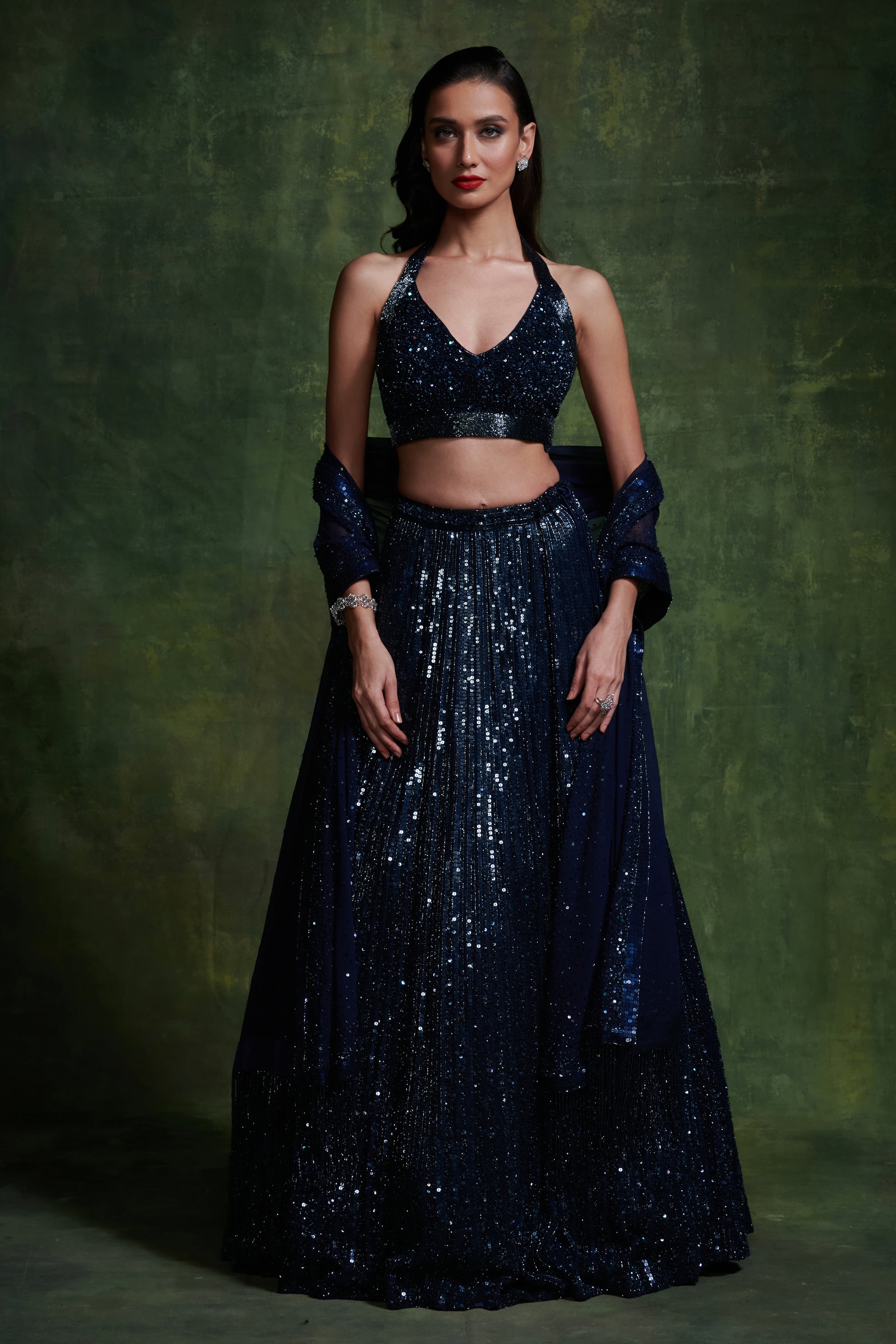 Drenched in deep navy and adorned with shimmering sequins, this couture lehenga is designed to dazzle. Every panel glisten with hand-embellished detail, making it a showstopper for evening celebrations.