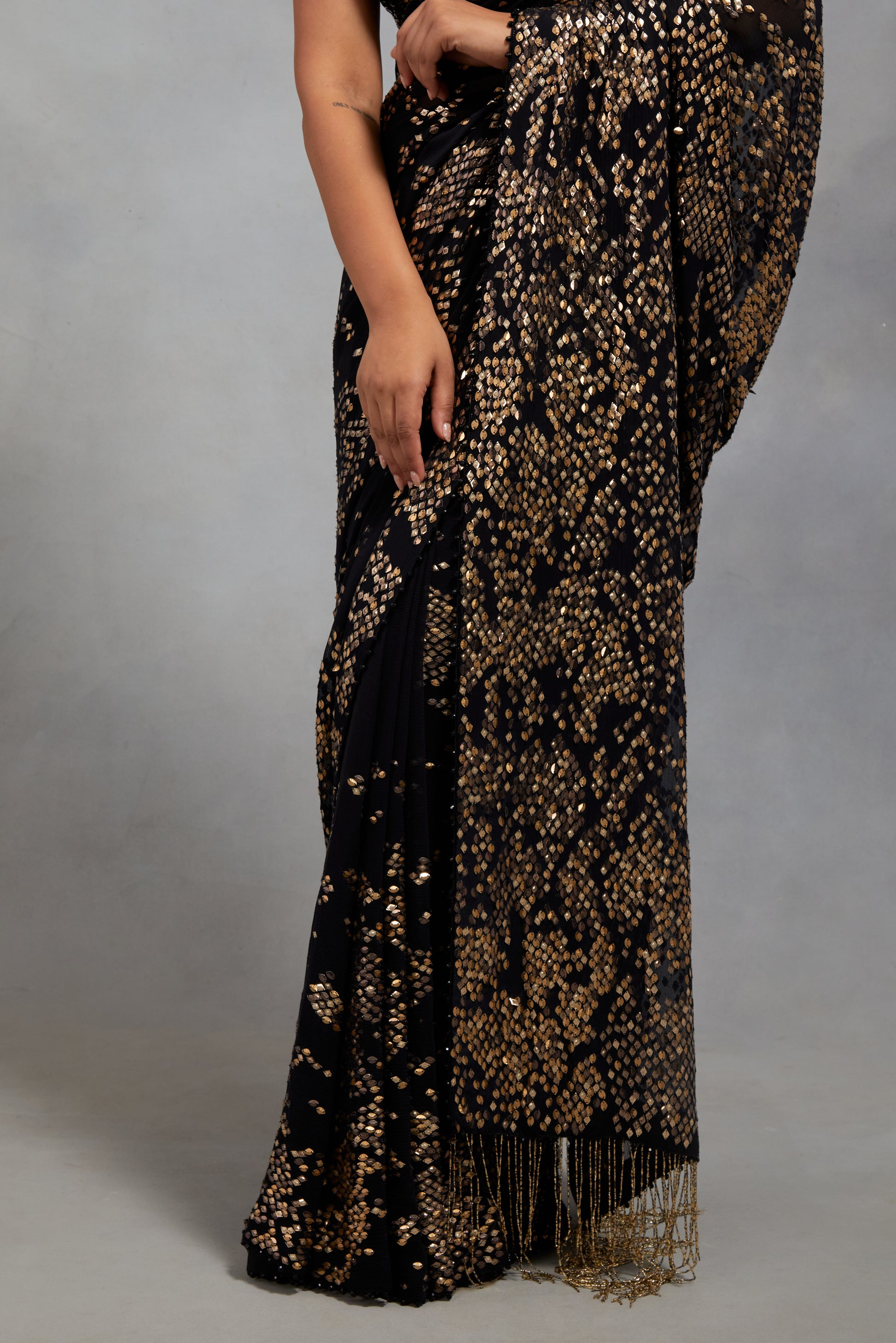 This sari features a snake-skin sequin embellishment that creates a subtle play of pattern and light without overwhelming the form. Sleek, fluid, and quietly decadent — an ode to modern couture, perfect for cocktail soirées, receptions or elevated evening celebrations.