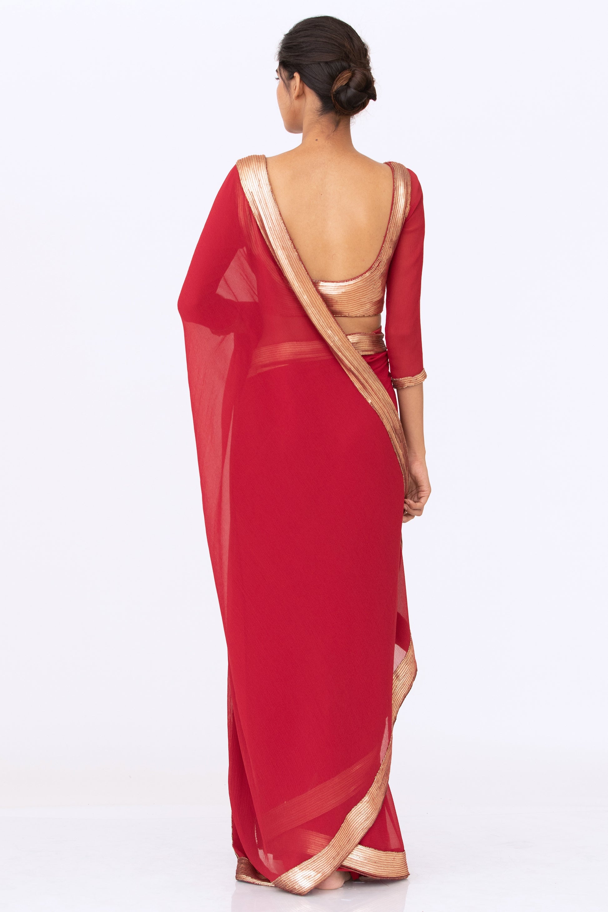Red Sari with a gold sequin border paired with a blouse in gold sequin
