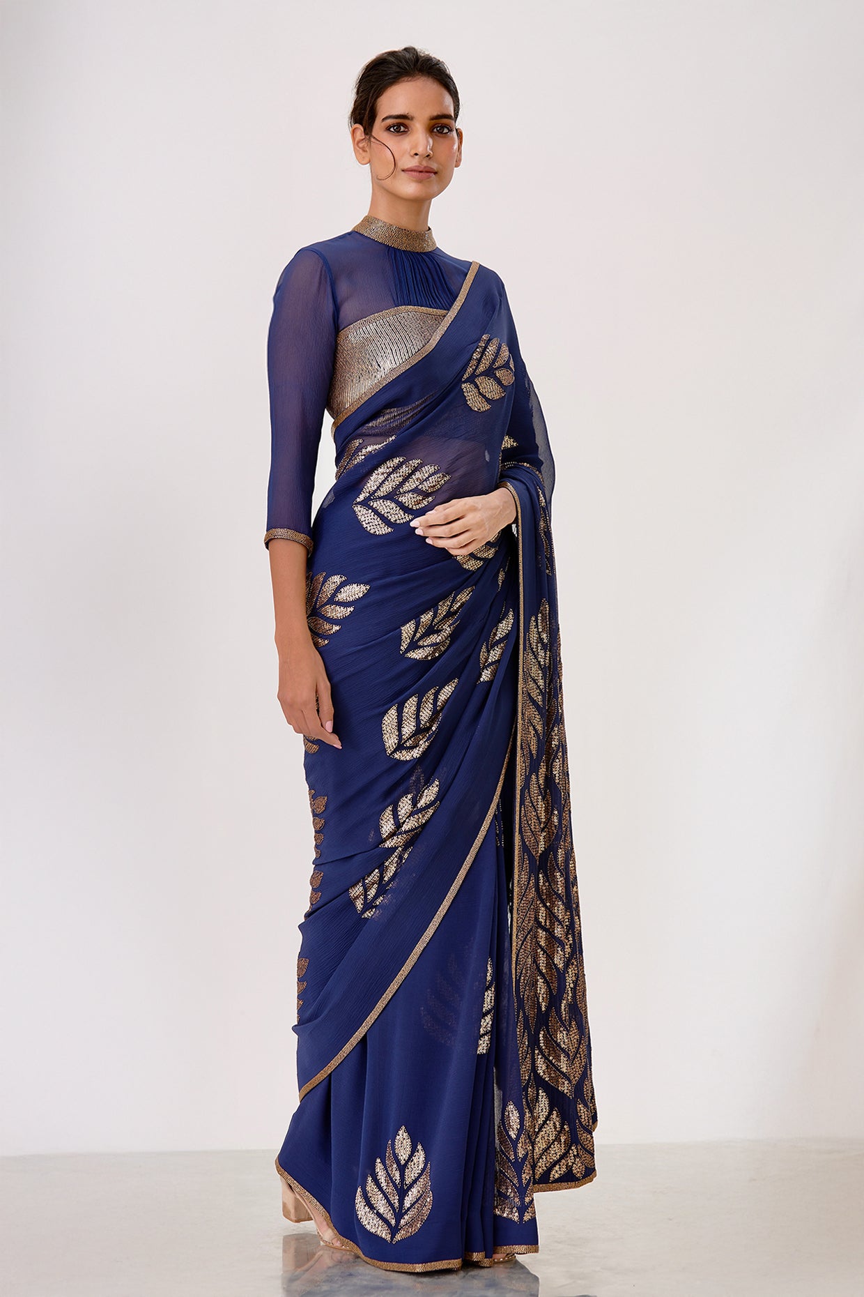 Sari with Leaf pattern sequin embroidery with sheeted gold sequin blouse