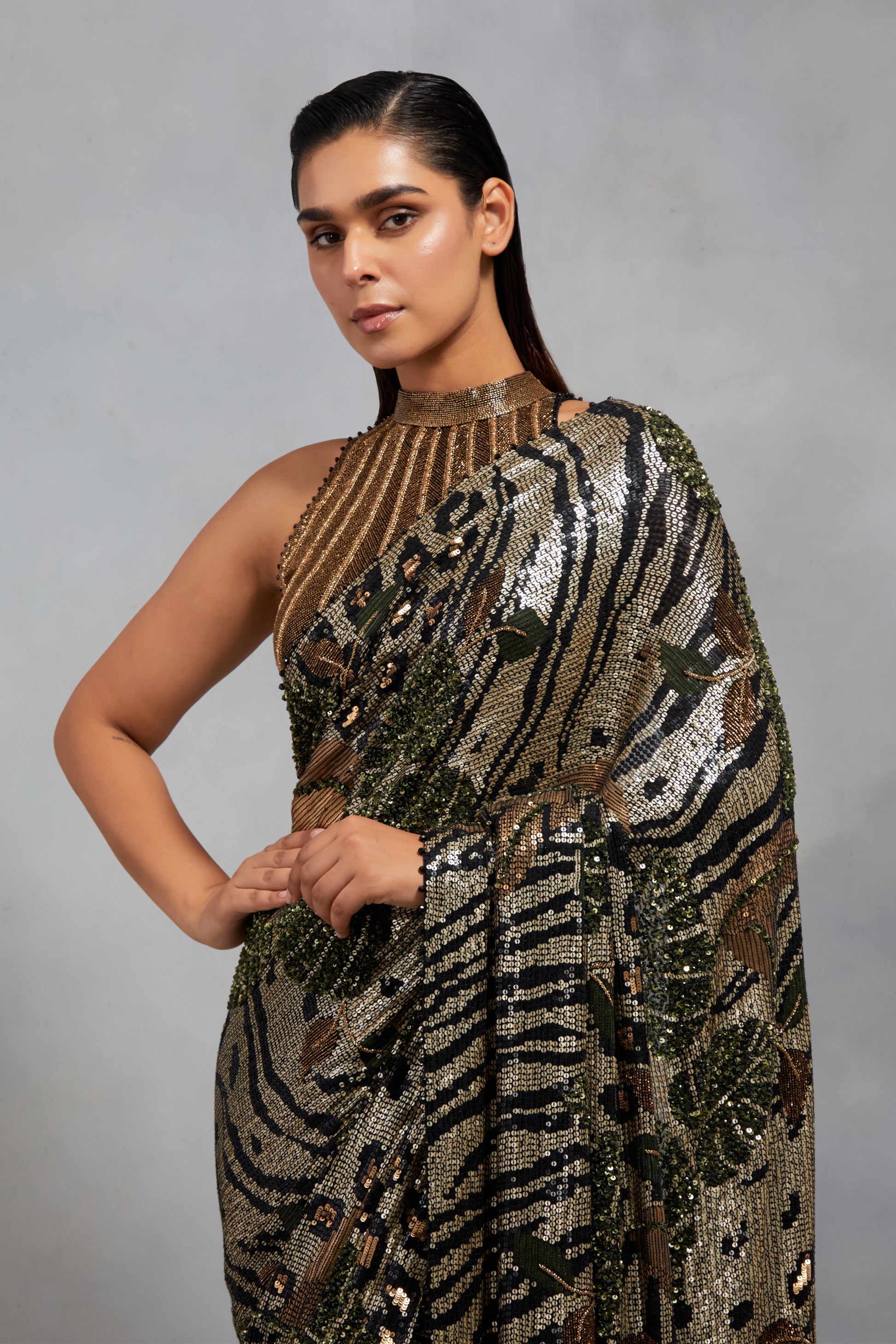 A play of artistry and restraint — this Sari is adorned with intricate animal and foliage embellishments that add subtle texture and visual intrigue without overwhelming its graceful silhouette. It blends the untamed beauty of wild with serenity of nature. Paired with an equally dramatic blouse.