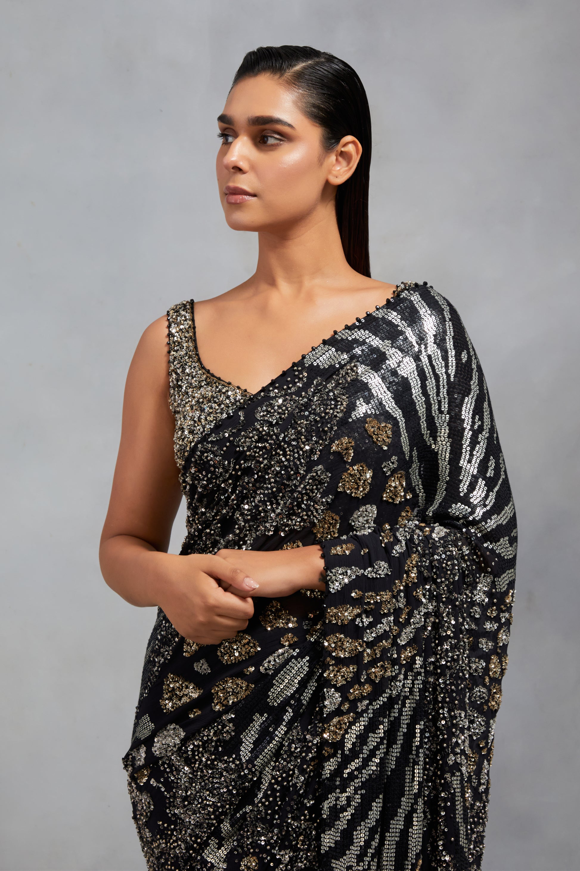 Step into the spotlight with this alligator designed sequin sari set. Intricate sequins mimic the luxe texture, draping you in edgy elegance. Perfect for red carpets, soirees. Paired with a shimmer filled blouse.