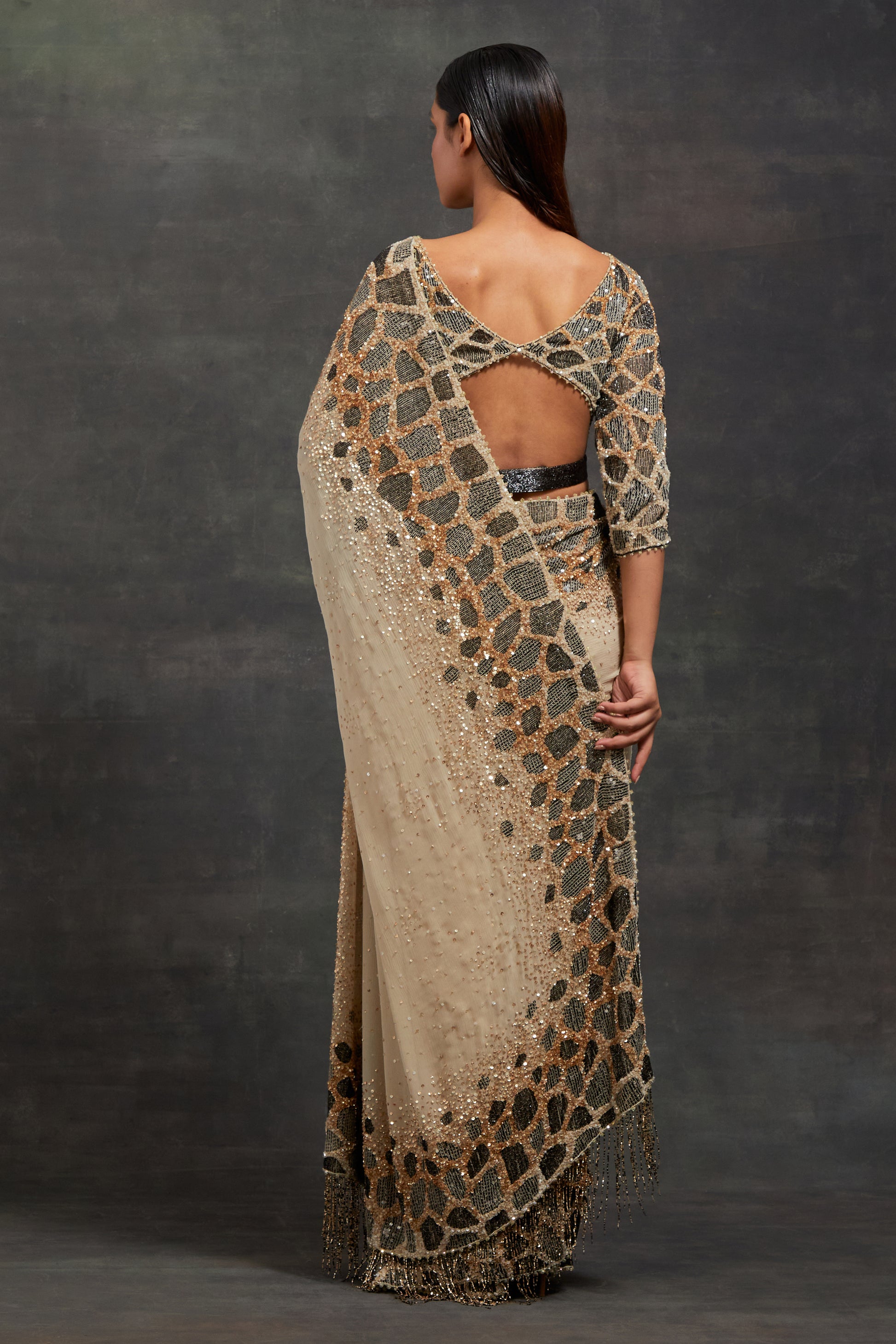 A luxurious sari set inspired by the natural beauty and patterns of a giraffe's coat, featuring sequin and cutdana embroidery along the border .Paired with an interesting blouse, the look reimagined in a sophisticated aesthetic.