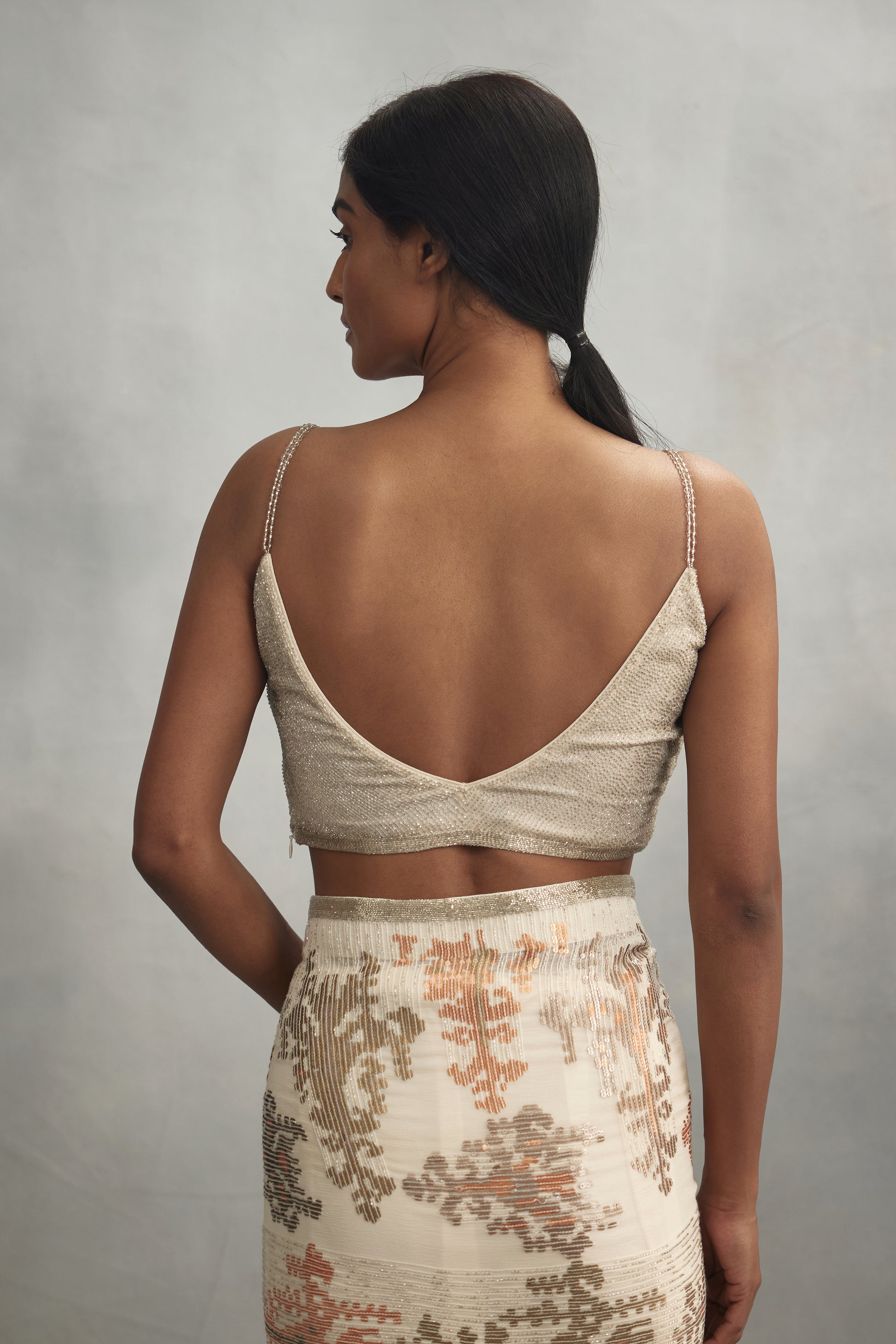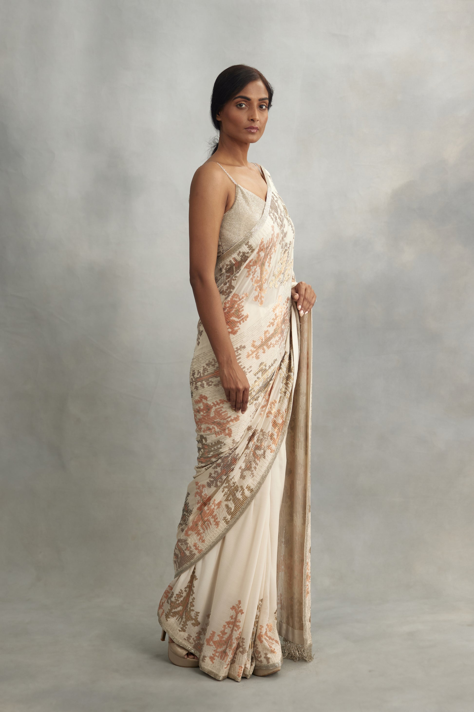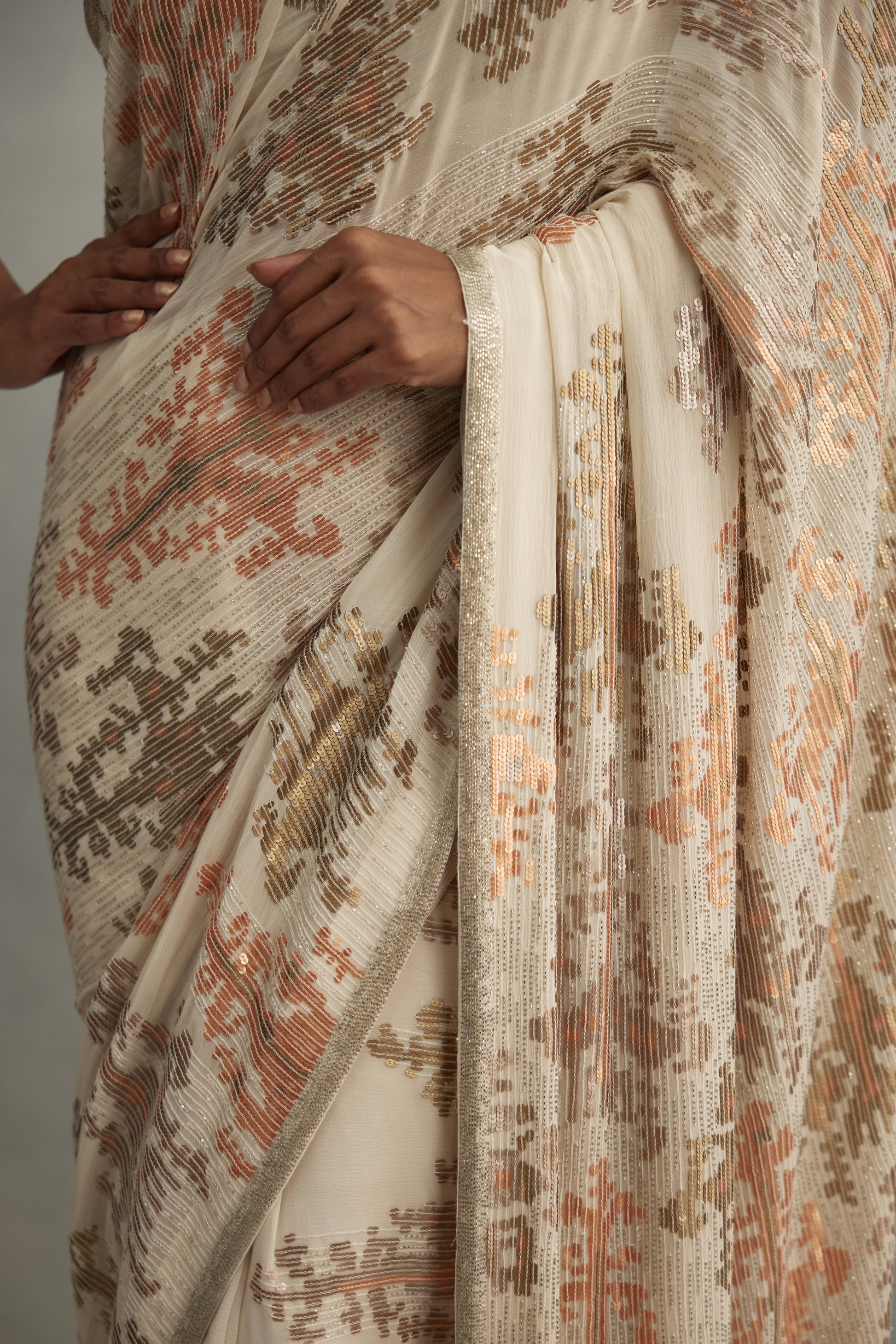 Sari in ikkat pattern done in mix small sequins paired with a cutdana blouse
