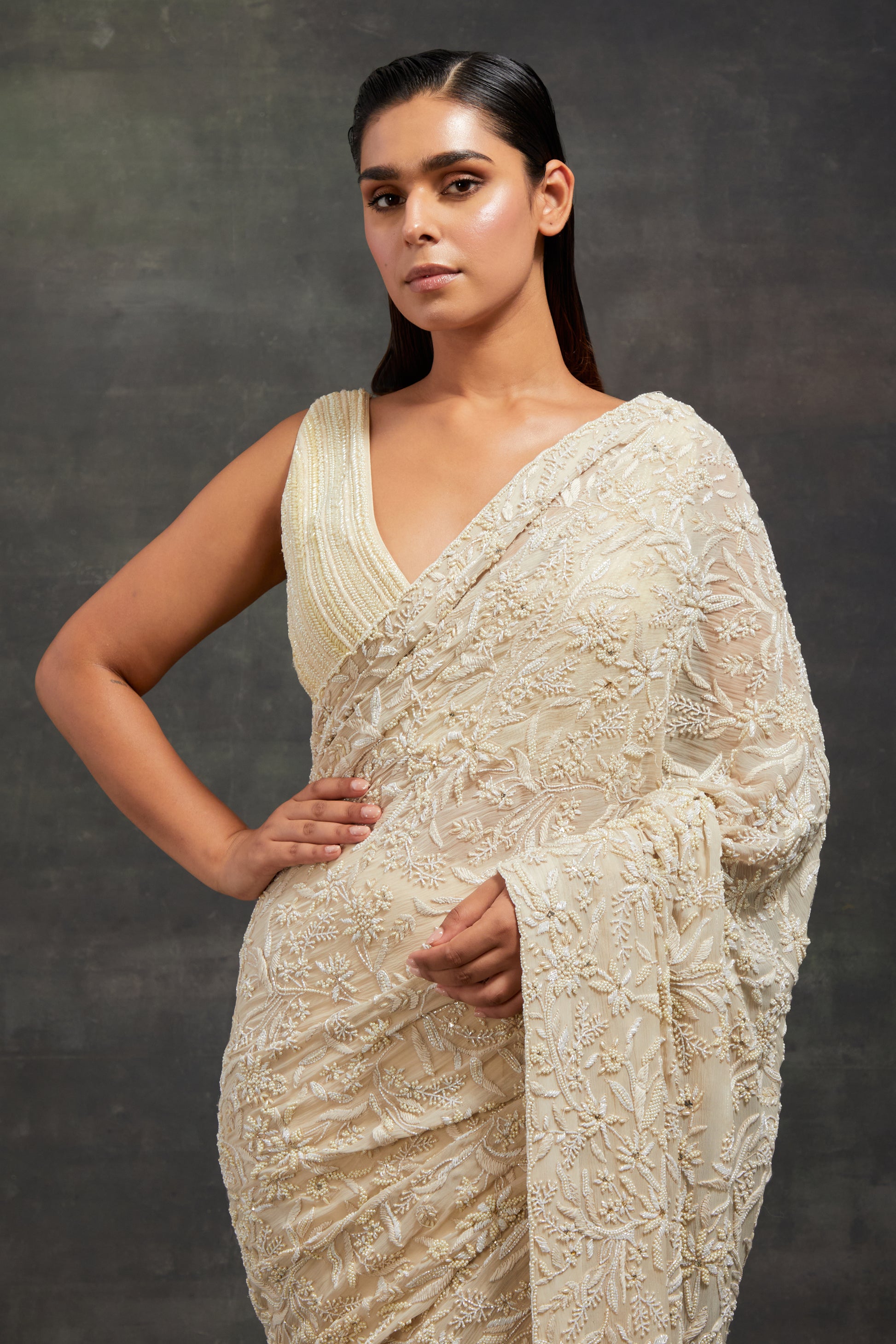 Softly luminous, this Sari Set is adorned with tonal pearl and thread embroidery, paired with a striped pearl embellished blouse, a harmonious blend of texture, light, and quiet elegance.