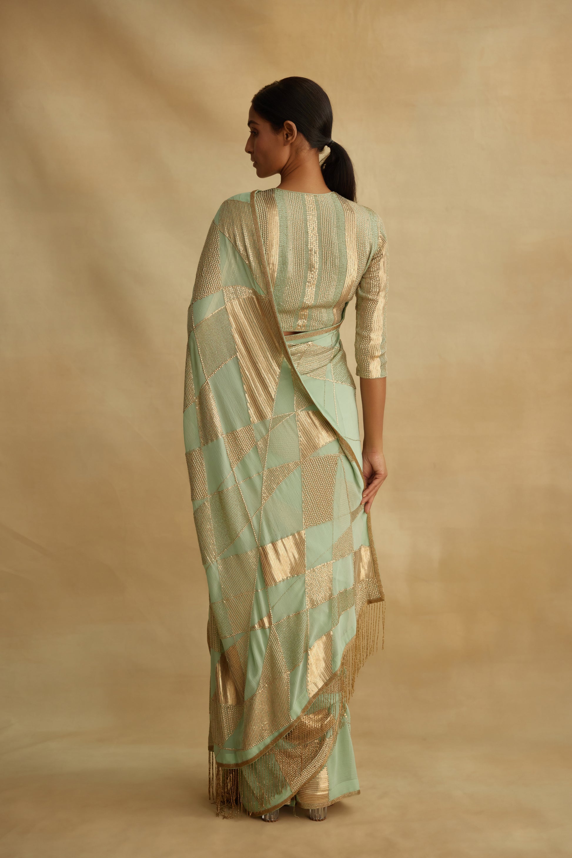 Sari in a trapeze geometric design in sequin embroidery paired with an all over stripe sequin blouse