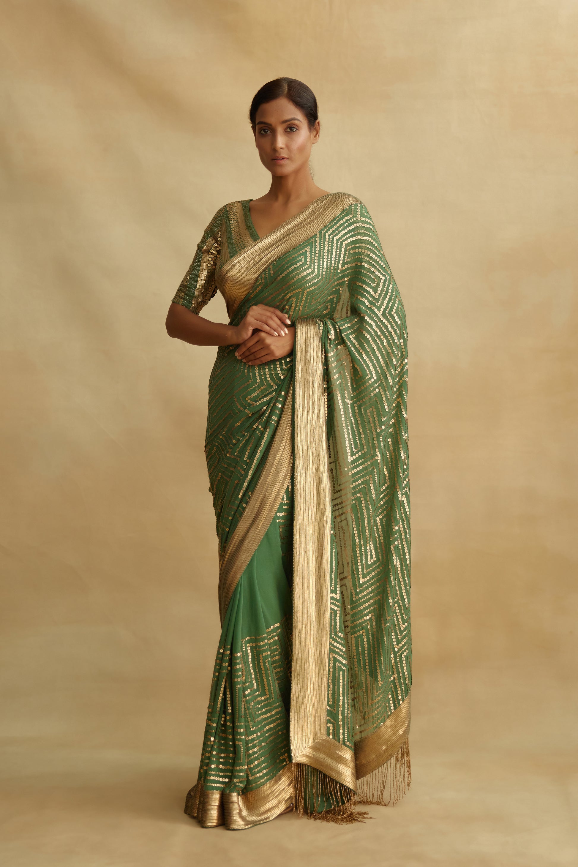 Forest green and gold sequin sari in a maze design, the look is completed with a spiral beads fully embroidered blouse