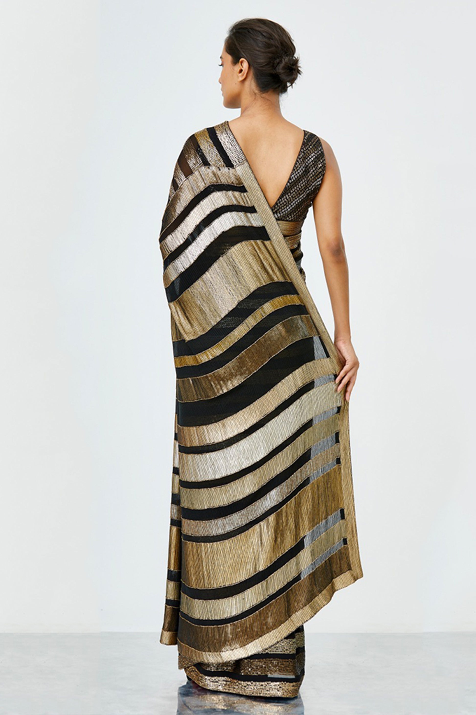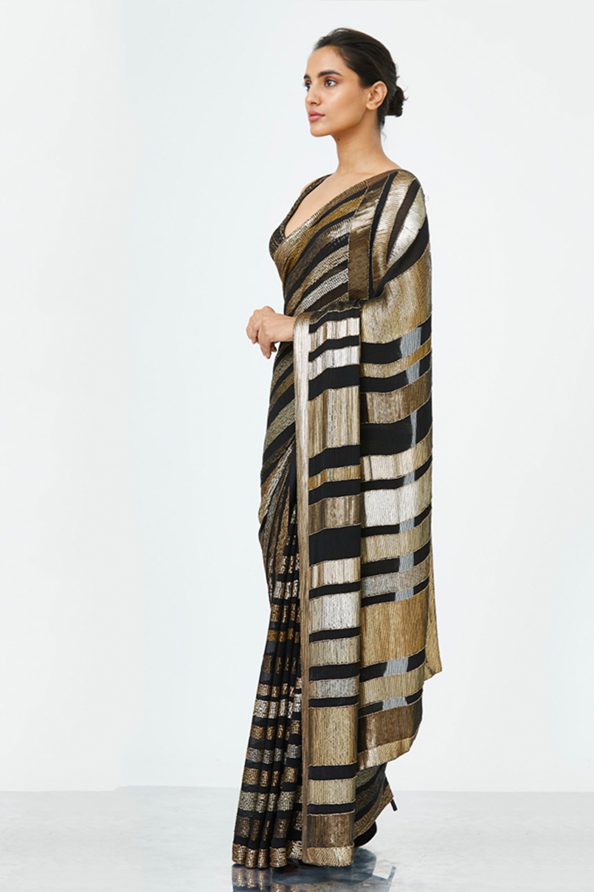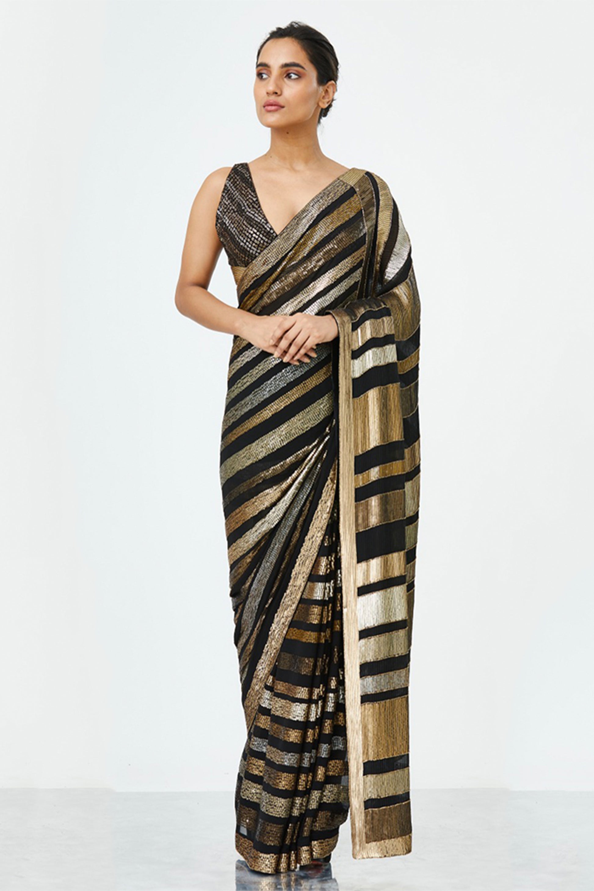Sari in sequin bands & stripes all over in metallics paired with a blouse