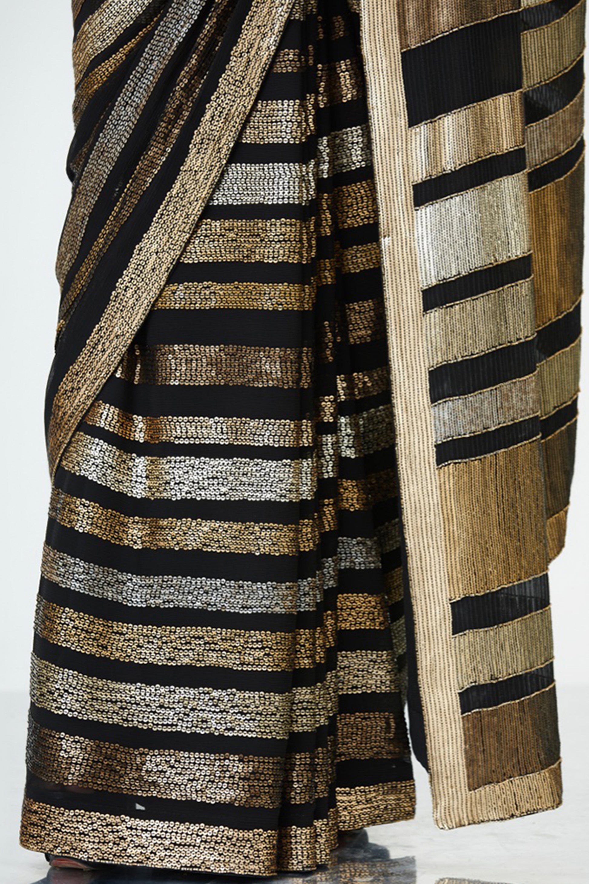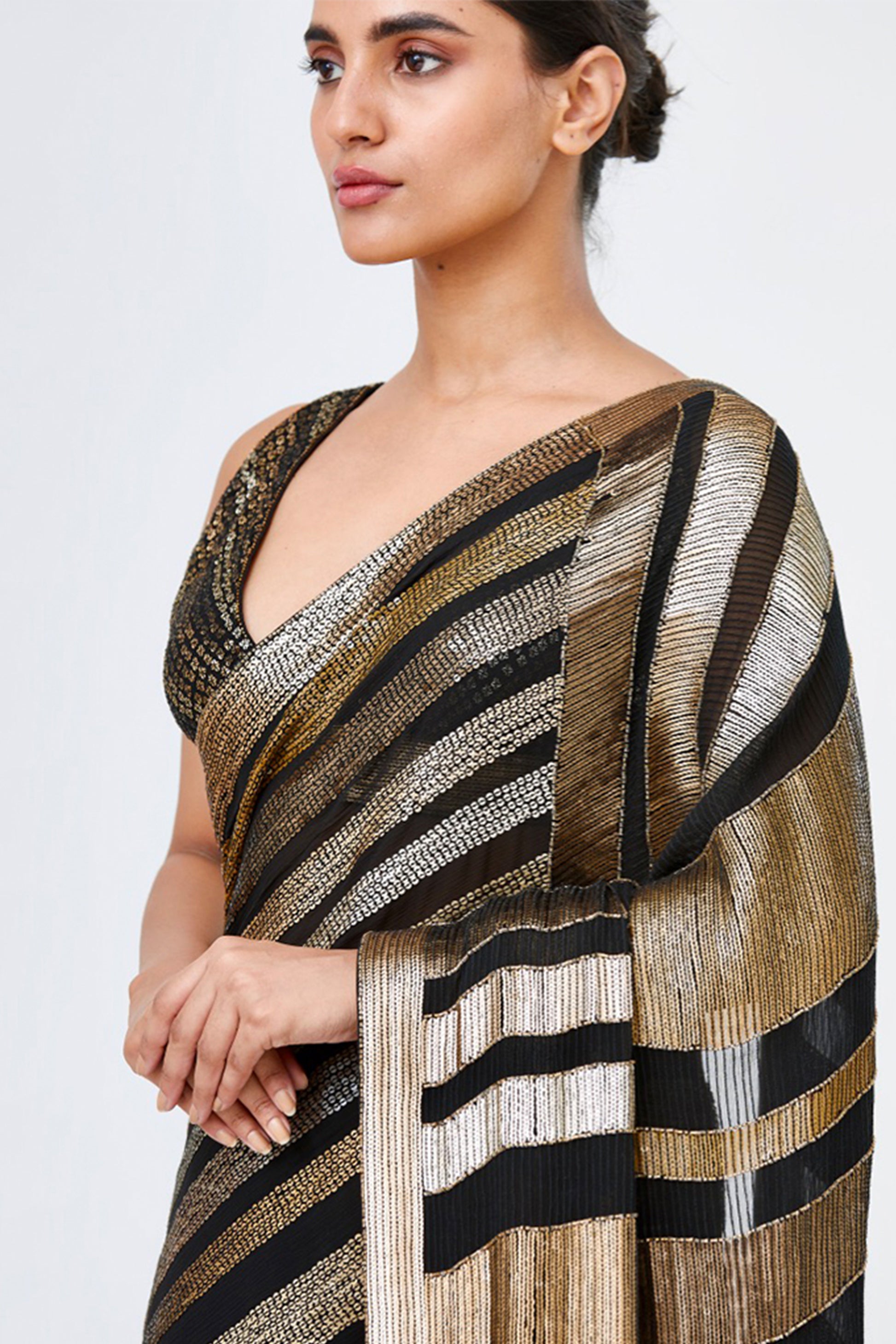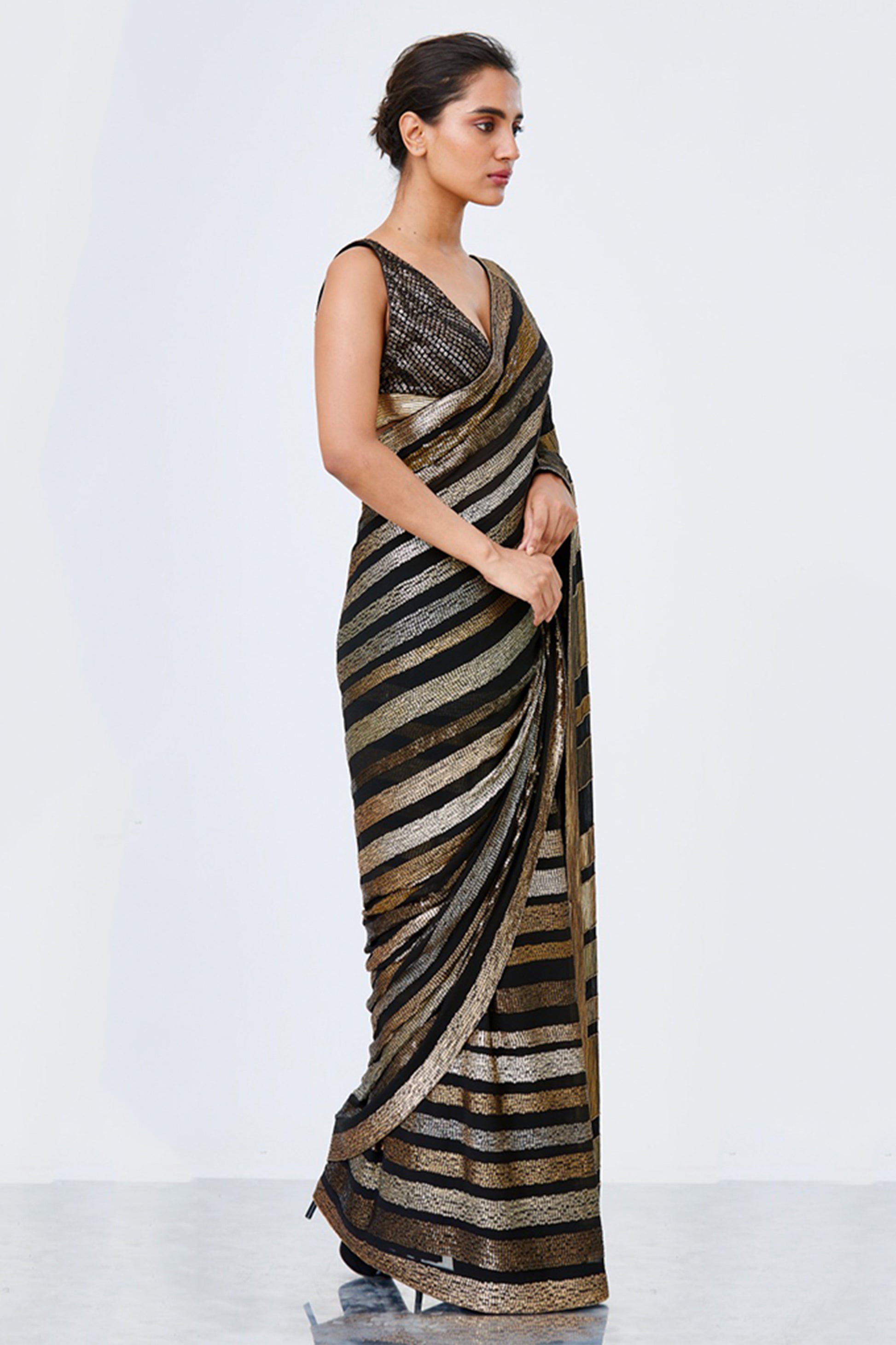 Sari in sequin bands & stripes all over in metallics paired with a blouse