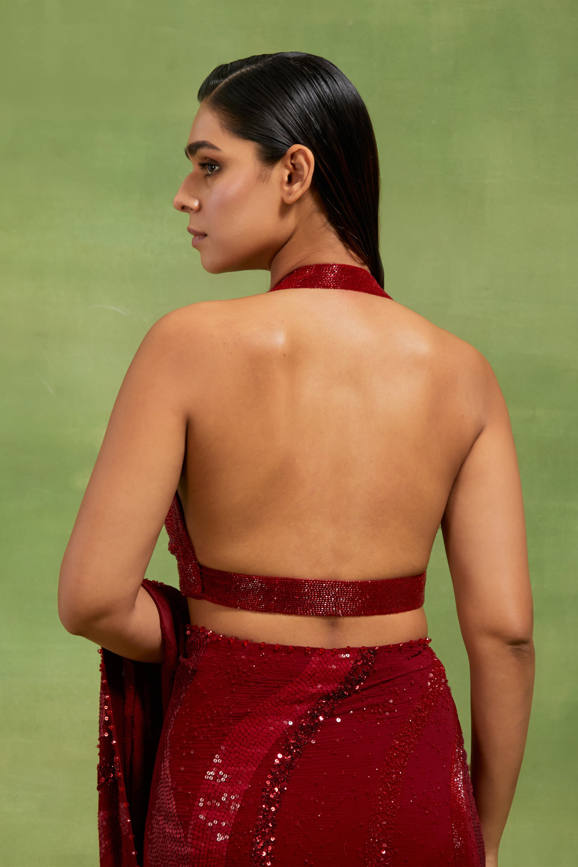 A statement in shimmer and sophistication — this Sari glistens in striped sheeted sequin embroidery, paired with a matching halter blouse in cutdana beadwork for a look that embodies effortless modern elegance.